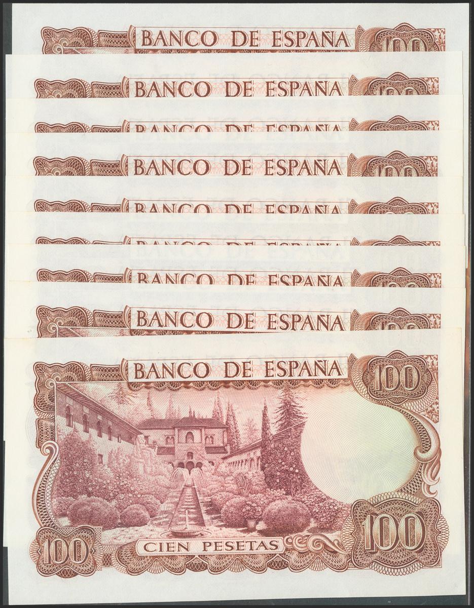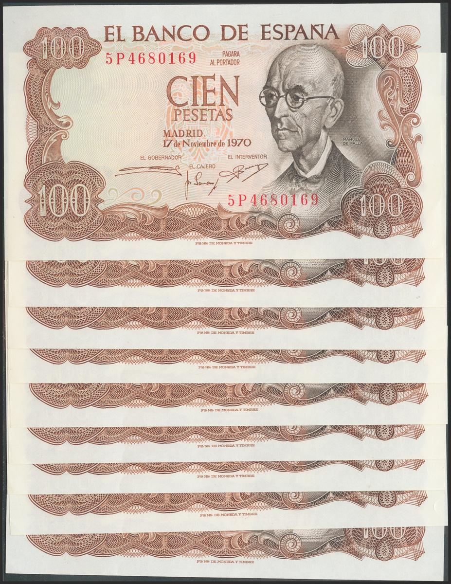 Set of 9 correlative banknotes of 100 Pesetas, issued on November 17, 1970 and with the series 5P (Edifil 2017: 472c). Uncirculated.