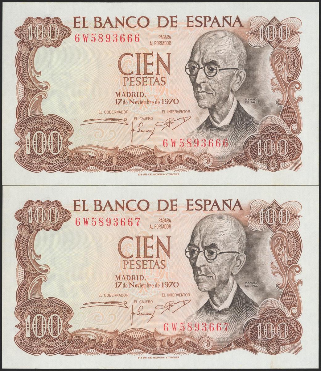 100 pesetas. November 17, 1970. Correlative pair. 6W series. (Edifil 2021: 472c). Uncirculated.