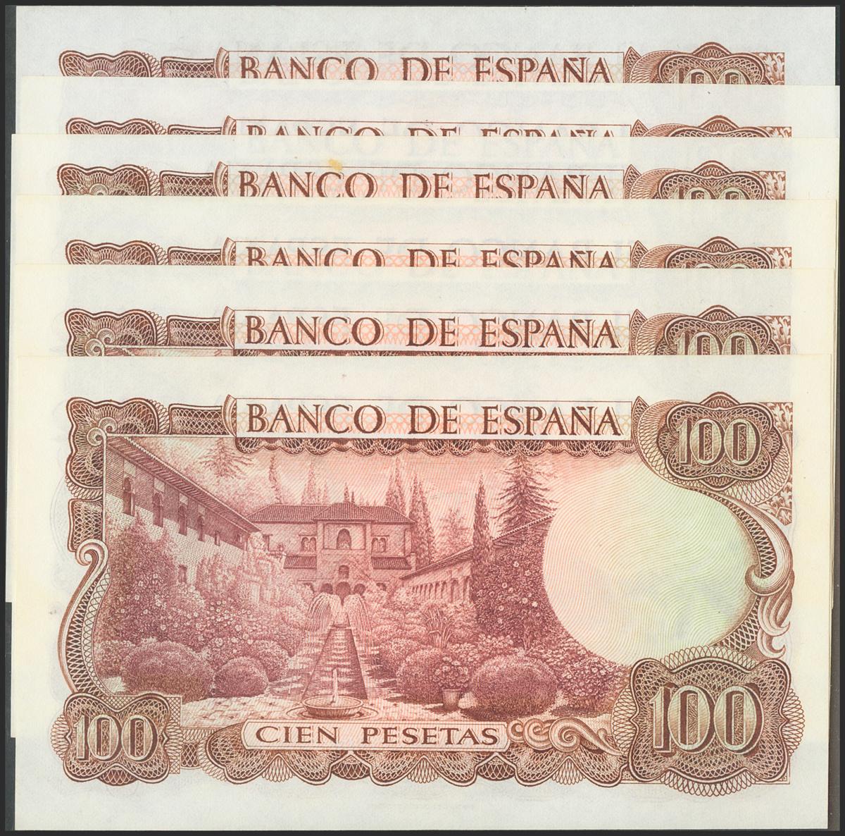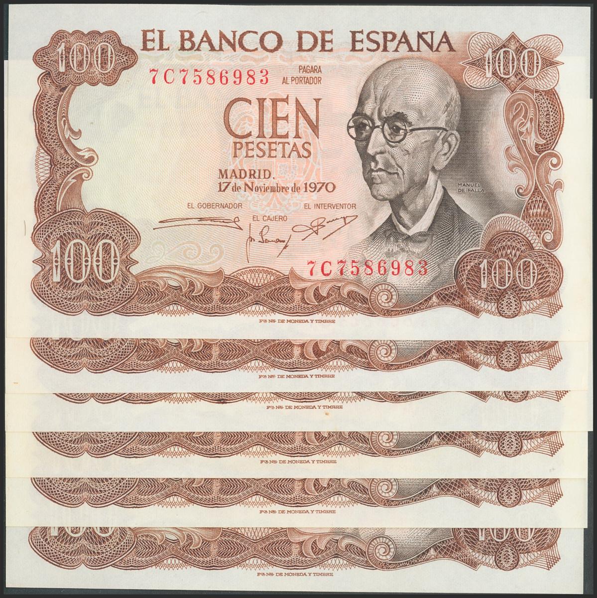 Set of 6 banknotes in almost correlative sections of 100 Pesetas, issued on November 17, 1970, with the 7C series (Edifil 2017: 472c), with its original size. Uncirculated/ Almost Uncirculated.
