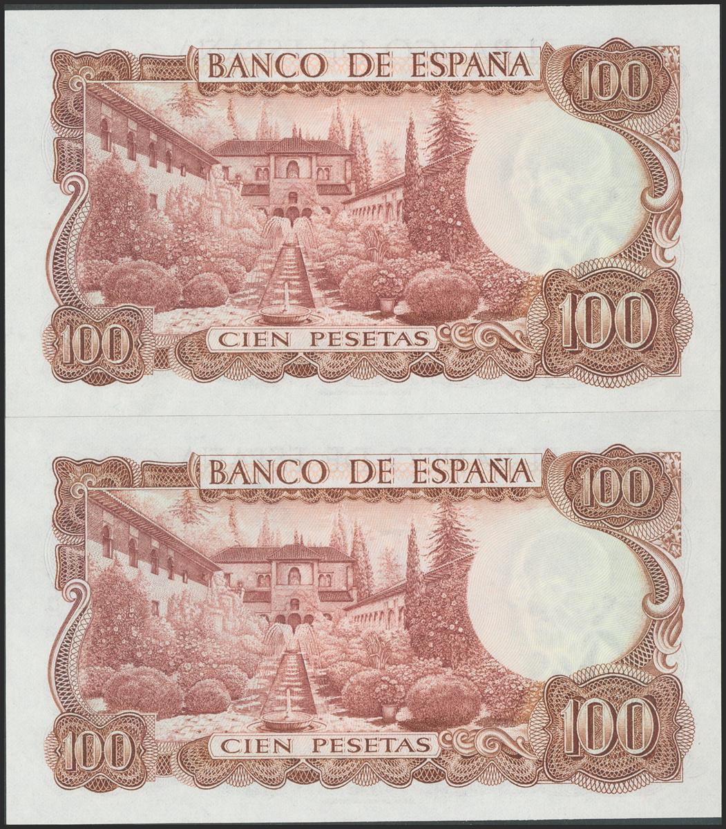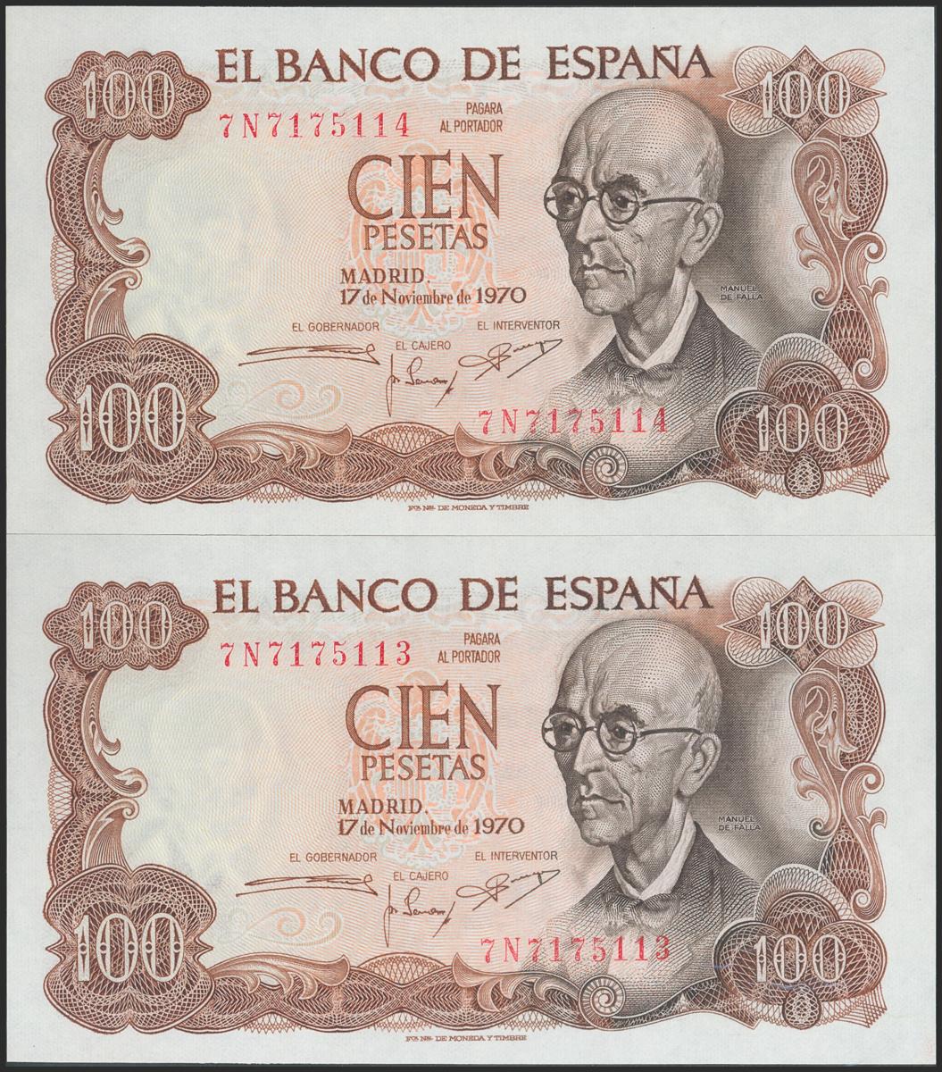 100 pesetas. November 17, 1970. Correlative pair. 7N series. (Edifil 2021: 472c). Uncirculated.