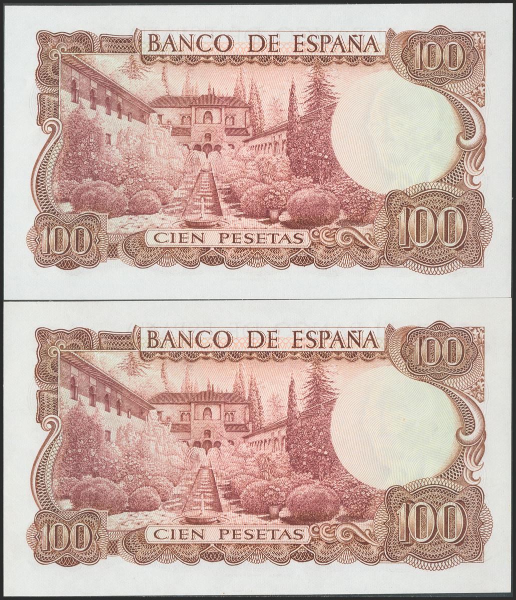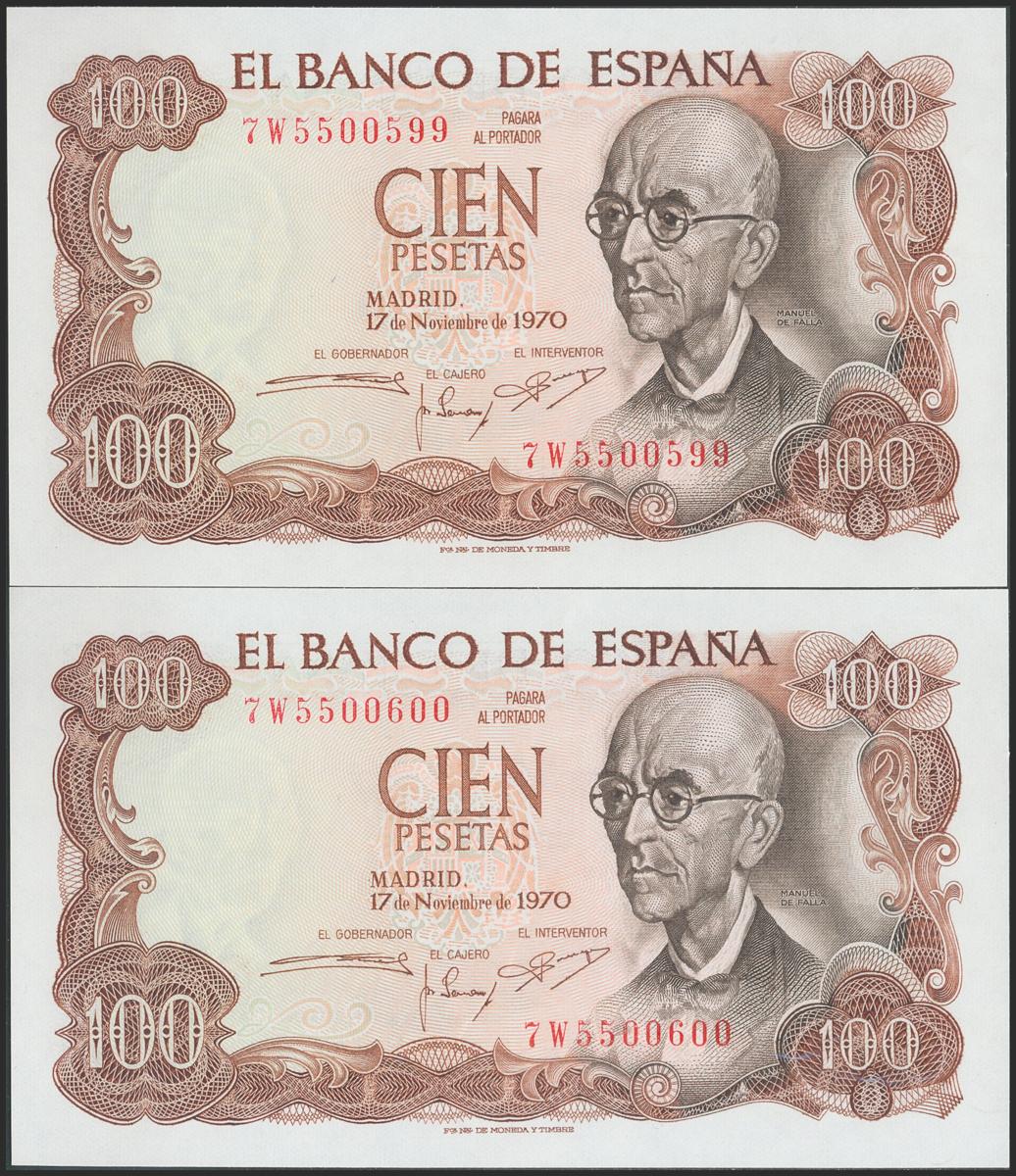 100 pesetas. November 17, 1970. Correlative pair. Series 7W, last series issued. (Edifil 2021: 472c). Almost Uncirculated.