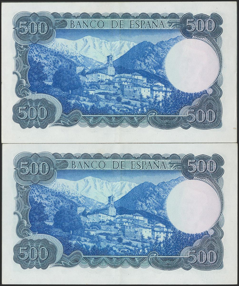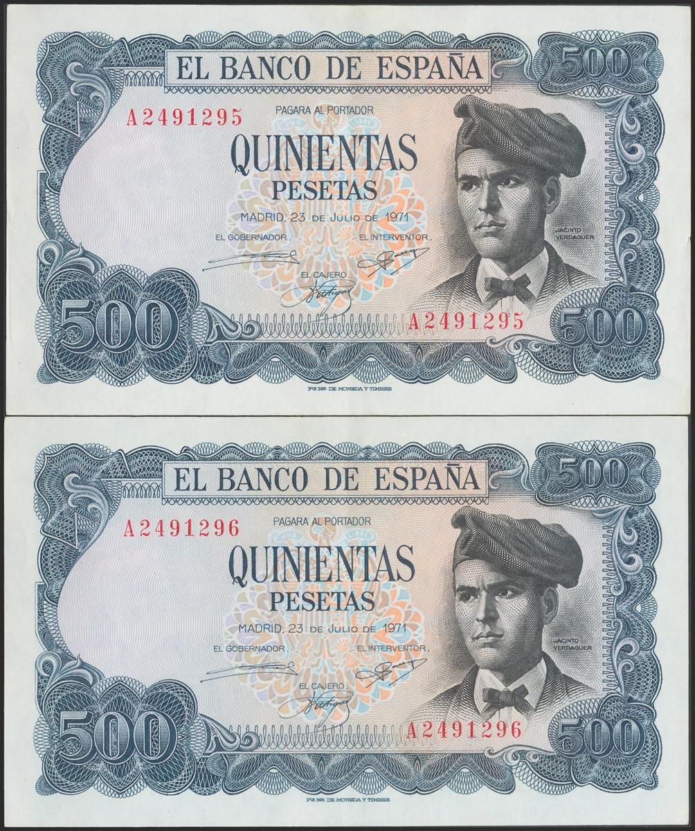 500 pesetas. July 23, 1971. Correlative couple. Series A. (Edifil 2021: 473a). Original sizing. Good Extremely Fine.