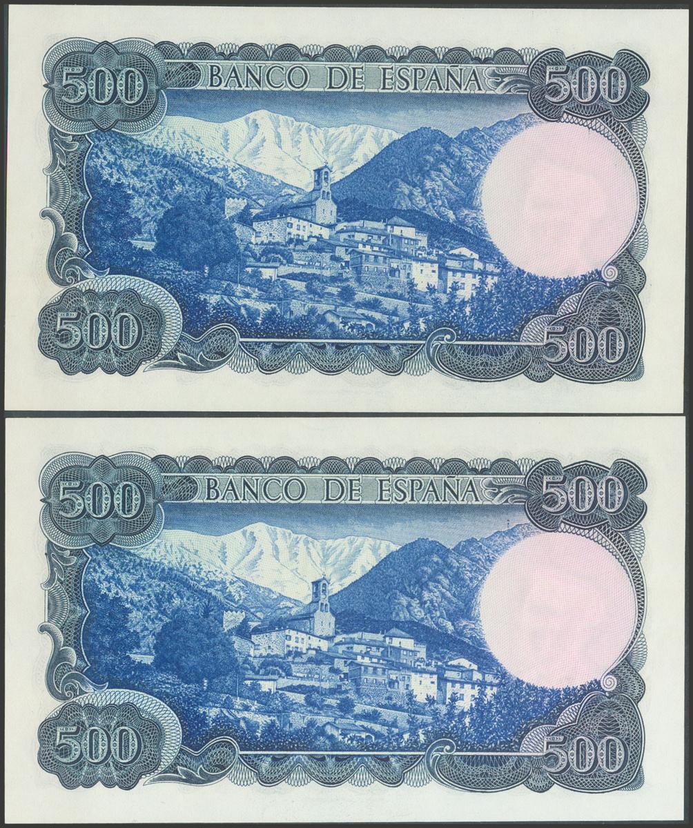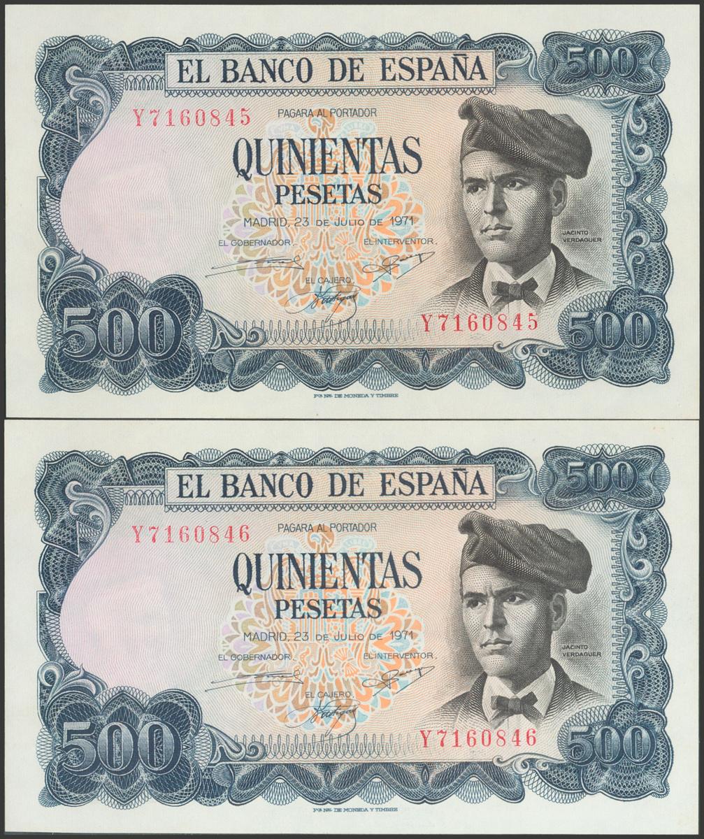 500 pesetas. July 23, 1971. Correlative couple. Series Y. (Edifil 2017: 473a). It retains part of the original size, a waviness that is very difficult to appreciate, which obviously does not break the fiber. Good Extremely Fine.