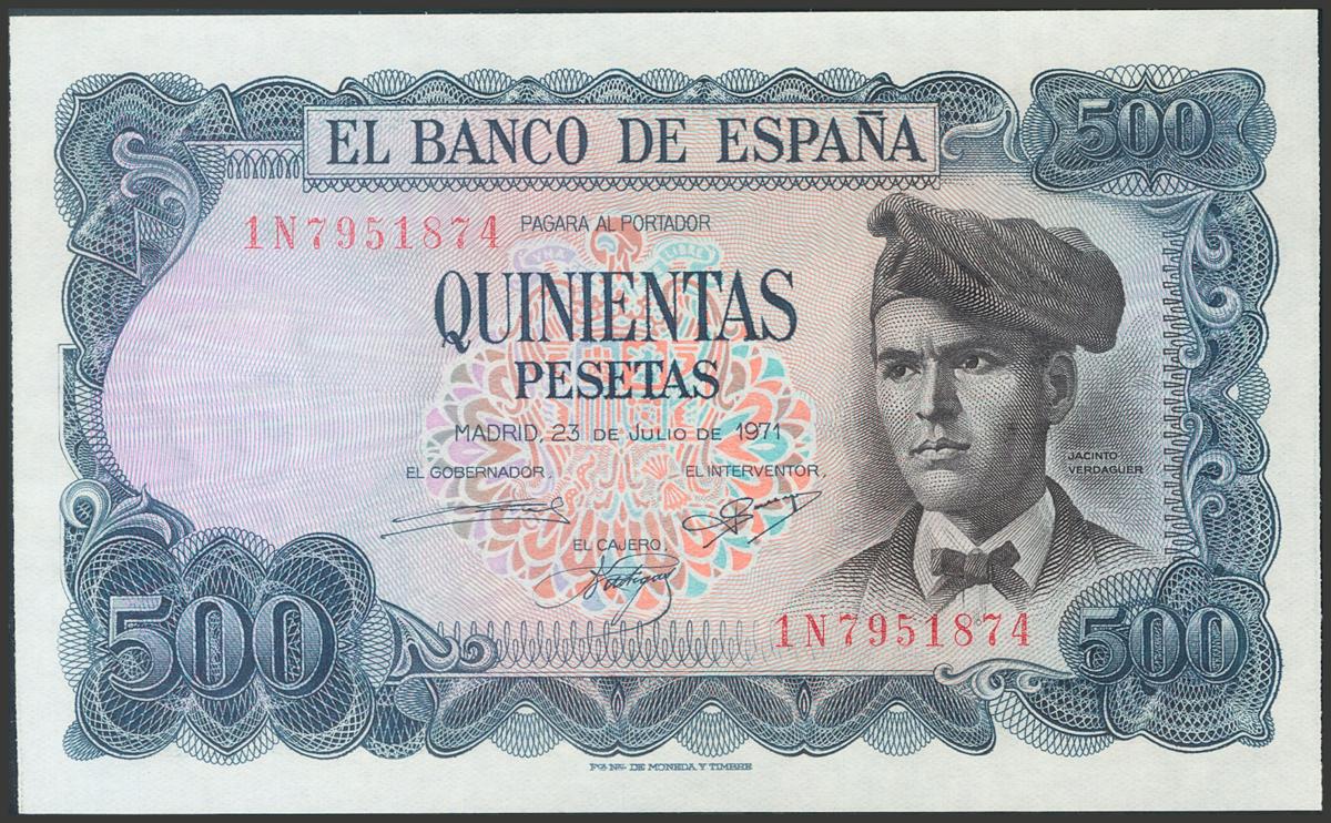 English 500 pesetas. July 23, 1971. Series 1N. (Edifil 2017: 473a). Original sizing. Almost Uncirculated.