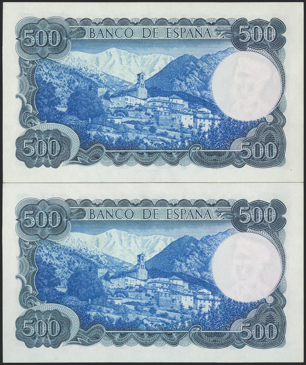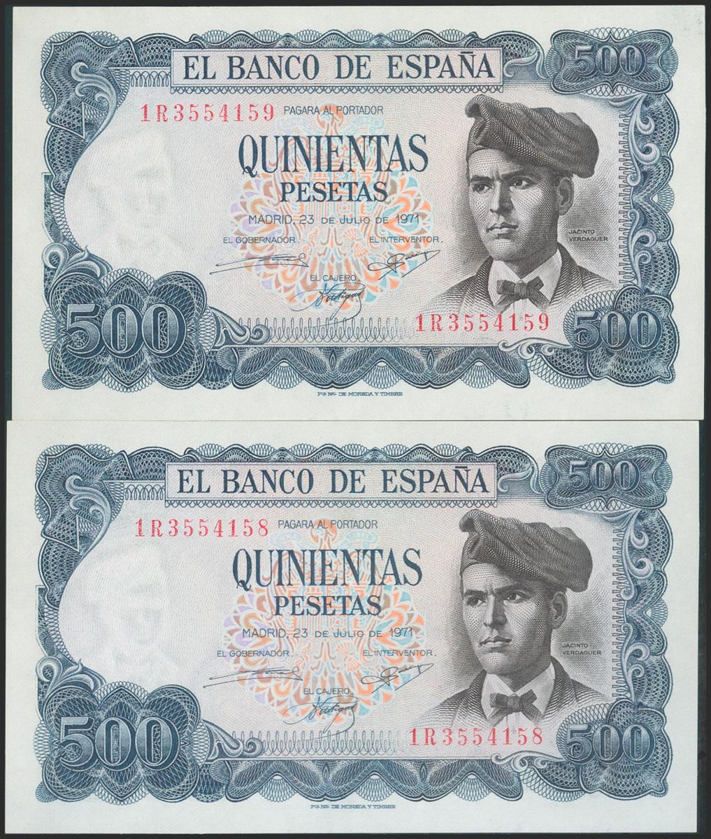 500 pesetas. July 23, 1971. Correlative couple. Series 1R, last series issued. (Edifil 2021: 473a). It keeps all its original size. Uncirculated.