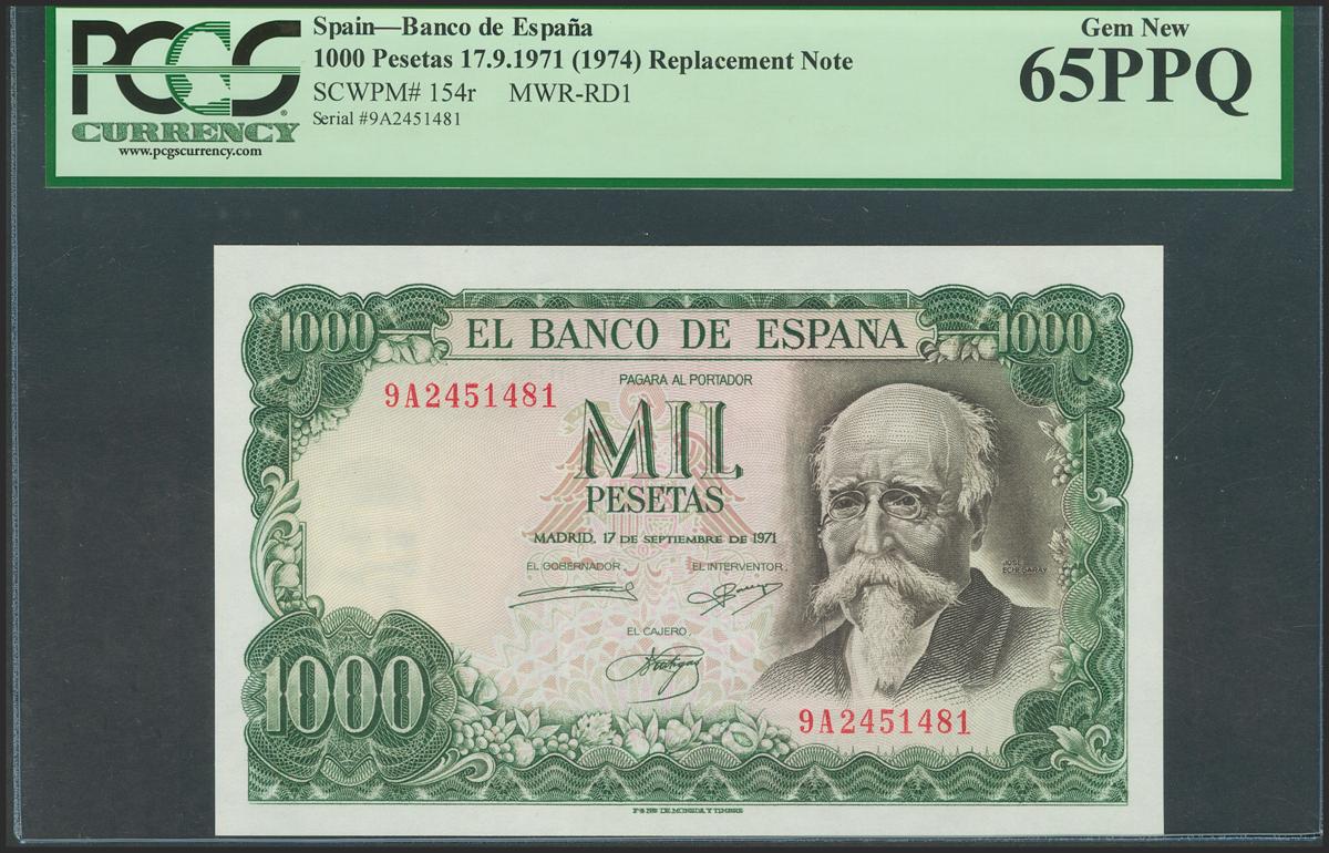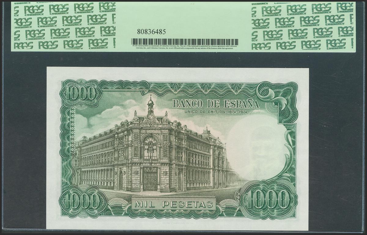 1000 Pesetas. September 17, 1971. Special Series 9A. (Edifil 2021: 474d). Rare and more in this quality, original sizing. Uncirculated. Packaged PMG65PPQ.