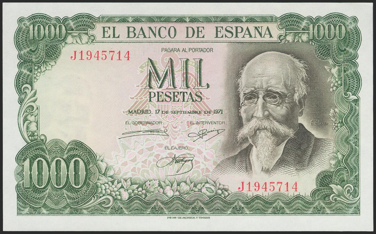 1000 Pesetas. September 17, 1971. Series J. (Edifil 2021: 474b). Original sizing. Uncirculated.