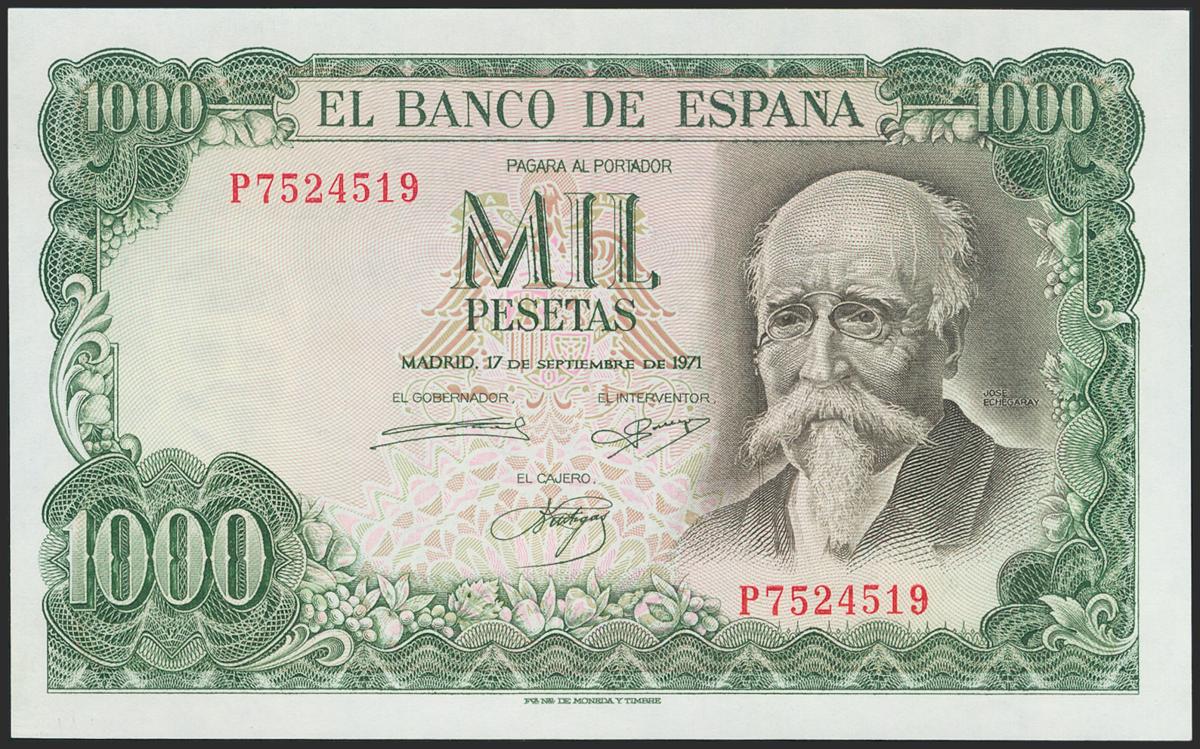 1000 Pesetas. September 17, 1971. Series P. (Edifil 2021: 474b). Retains much of the original size. Good Extremely Fine.
