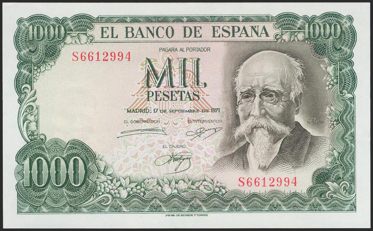 English 1000 Pesetas. September 17, 1971. Series S. (Edifil 2021: 474b). Retains much of the original size. Good Extremely Fine.