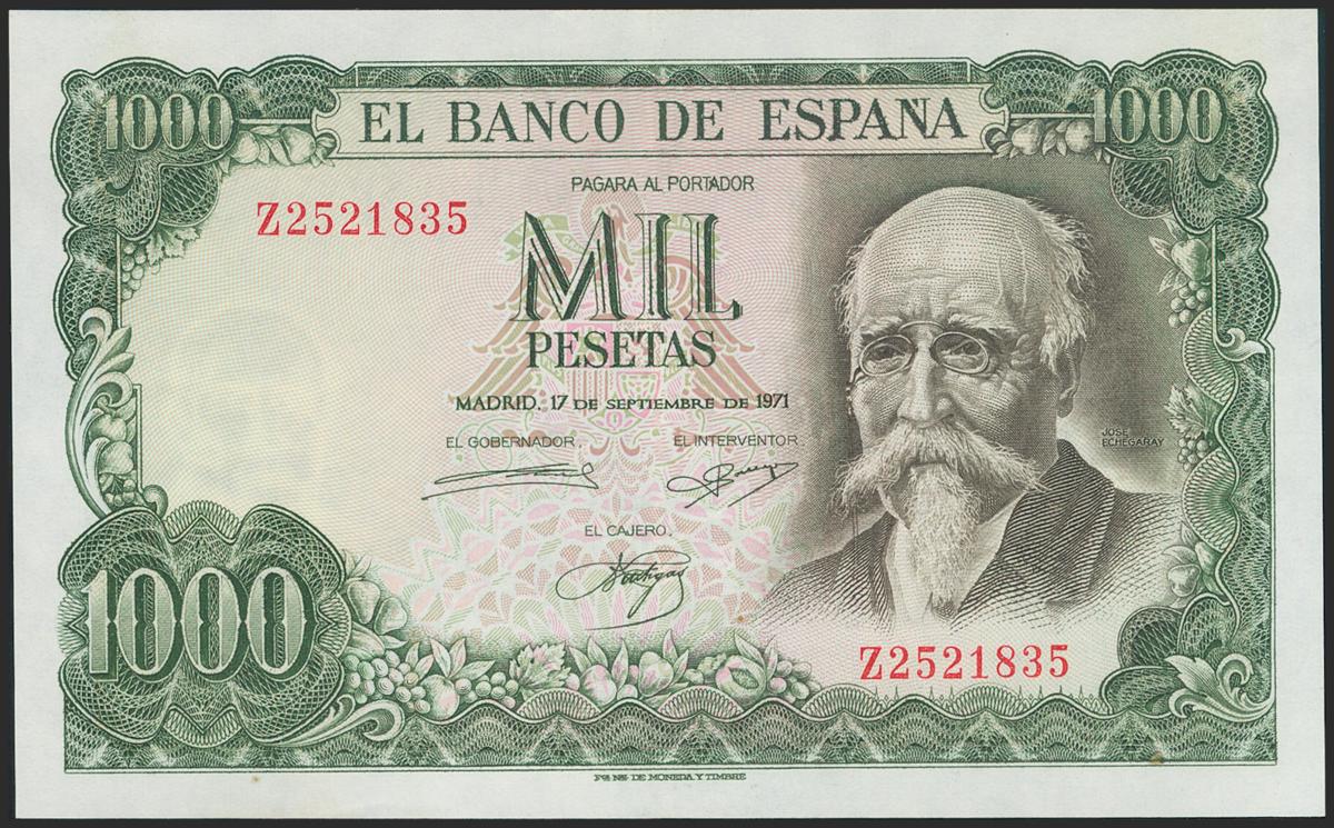 English 1000 Pesetas. September 17, 1971. Series Z. (Edifil 2021: 474b). Retains much of the original size. Good Extremely Fine.