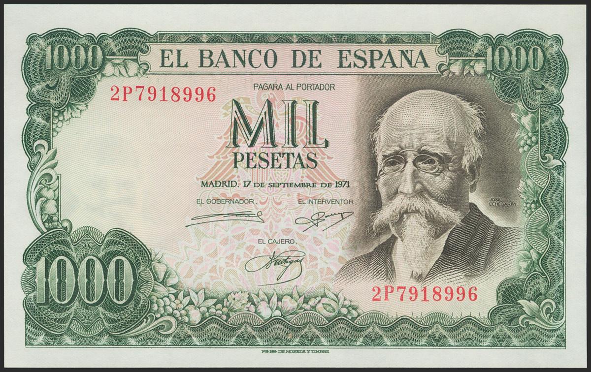 English 1000 Pesetas. September 17, 1971. Series 2P. (Edifil 2021: 474c). It keeps all its original size. Uncirculated.
