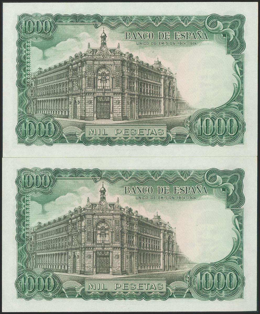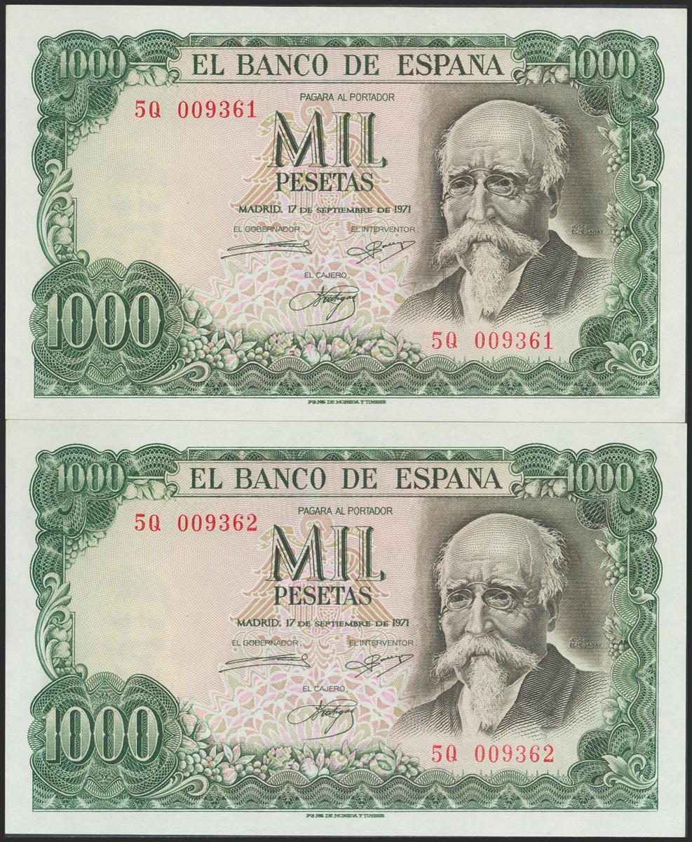 1000 Pesetas. September 17, 1971. Correlative pair. 5Q series. (Edifil 2021: 474c). Original sizing. Almost Uncirculated.
