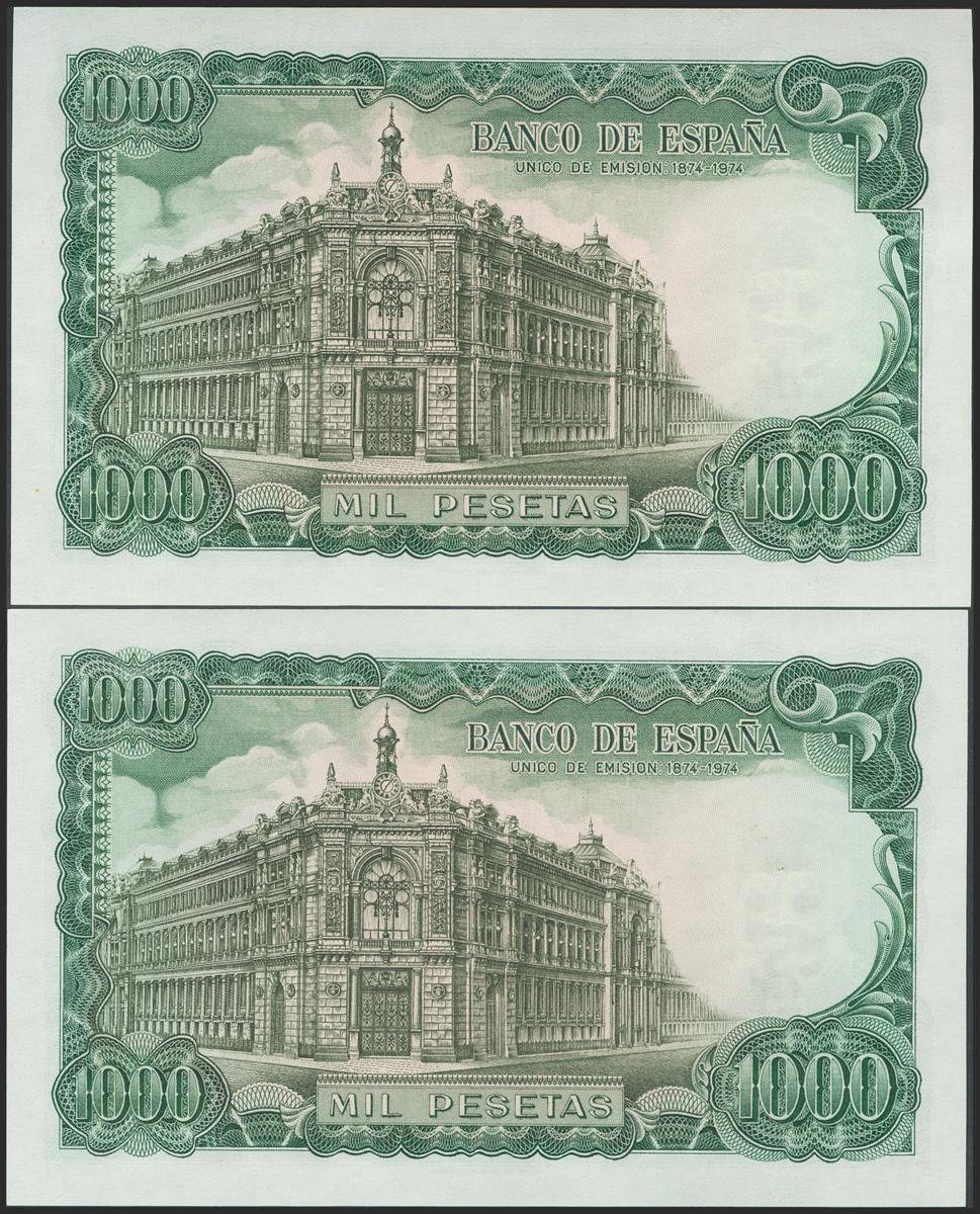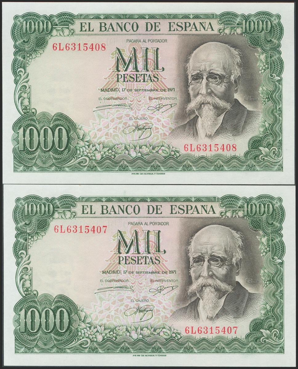 English 1000 Pesetas. September 17, 1971. Correlative pair. 6L series. (Edifil 2021: 474c). Original sizing. Uncirculated.