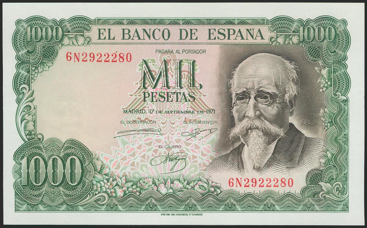1000 Pesetas. September 17, 1971. Series 6N. (Edifil 2021: 474c). Original sizing. Uncirculated.