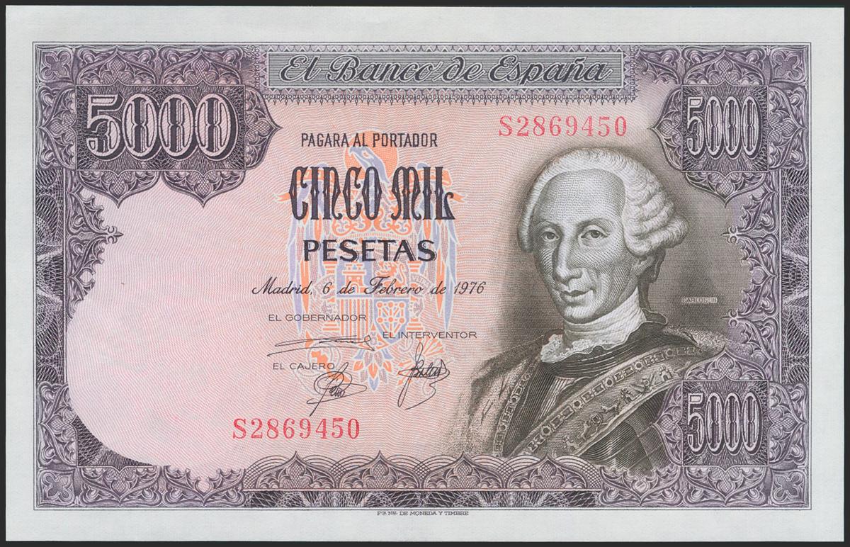 5000 pesetas. February 6, 1976. Series S. (Edifil 2021: 475a). It retains a large part of its original size. Extremely Fine.