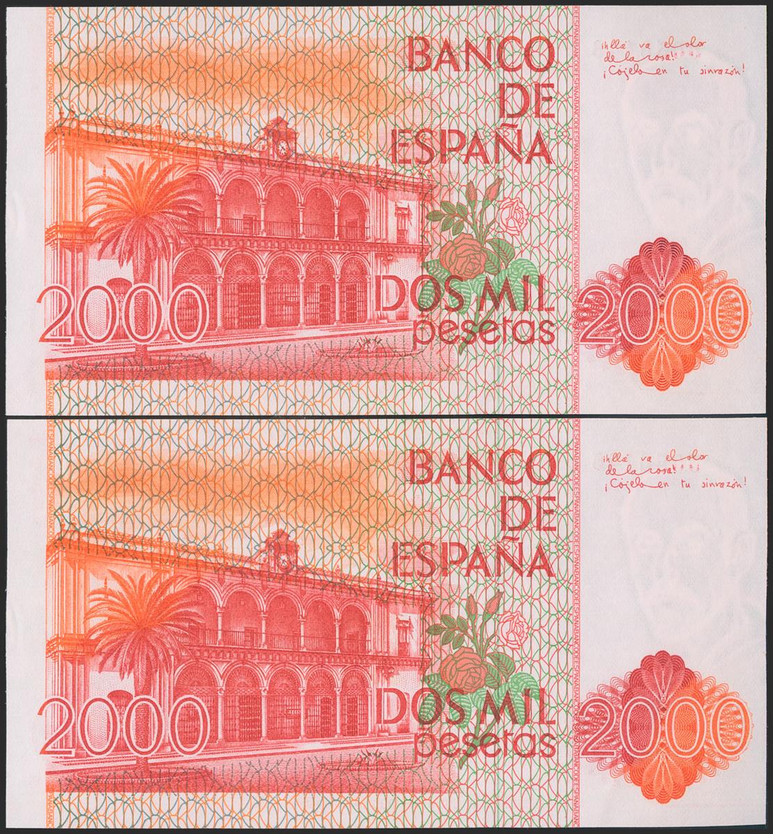 2000 pesetas. July 22, 1980. Correlative couple. No series and very low numbering. (Edifil 2021: 479). Uncirculated/ Almost Uncirculated.