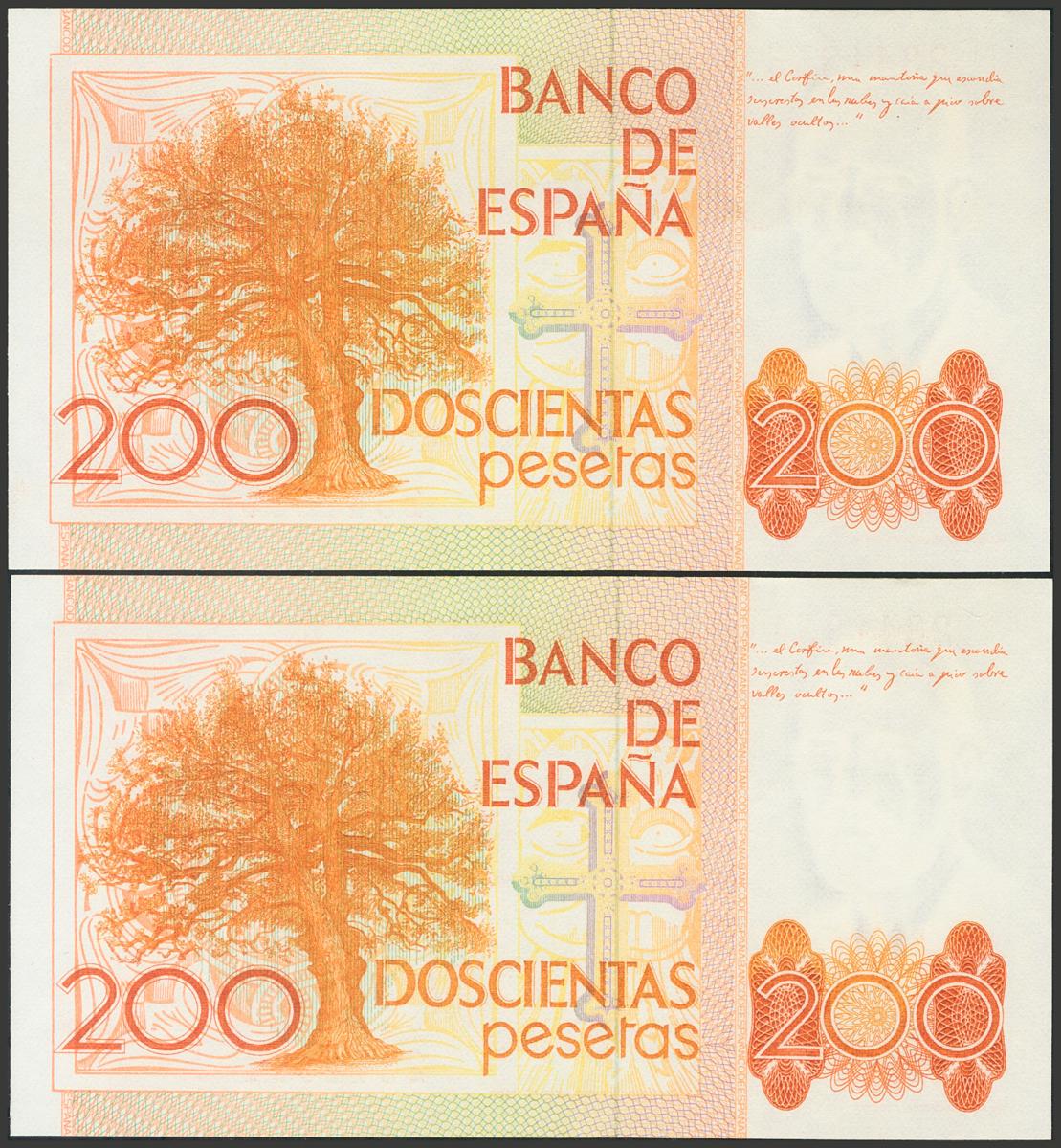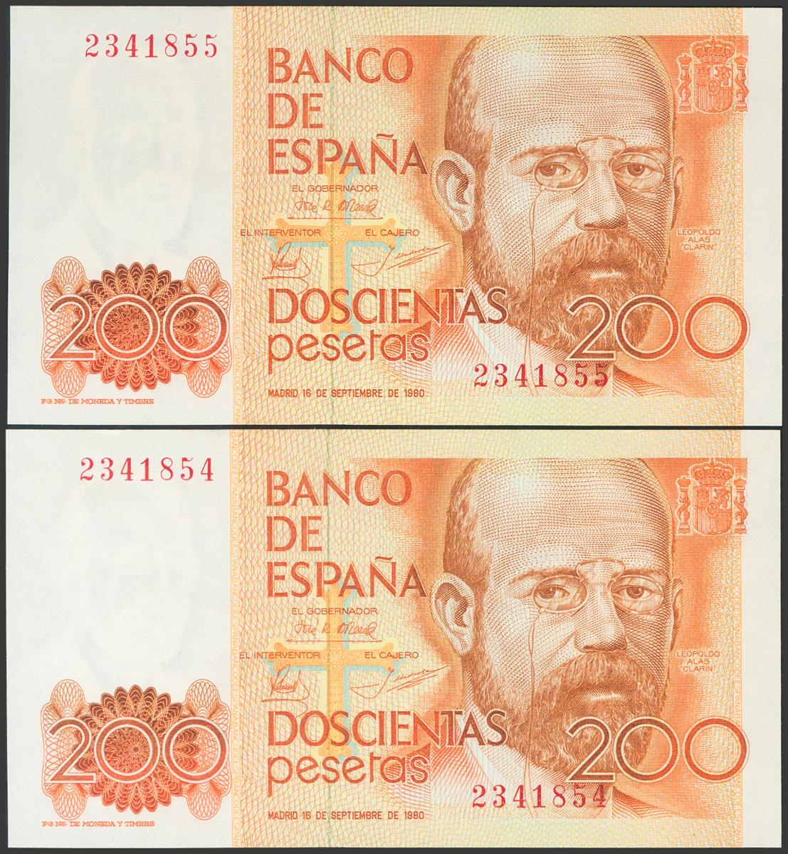 200 pesetas. September 16, 1980. Correlative pair. No serie. (Edifil 2017: 480). Uncirculated/ Almost Uncirculated.