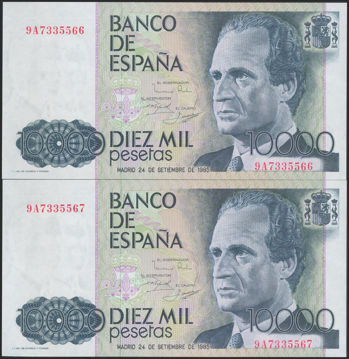 10000 Pesetas. September 24, 1985. Correlative pair. Series 9A, special numbering. (Edifil 2017: 481b). Almost Uncirculated.