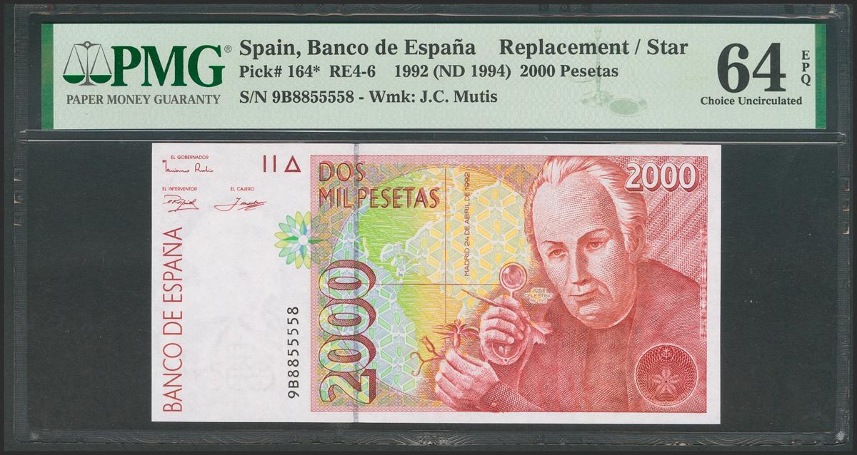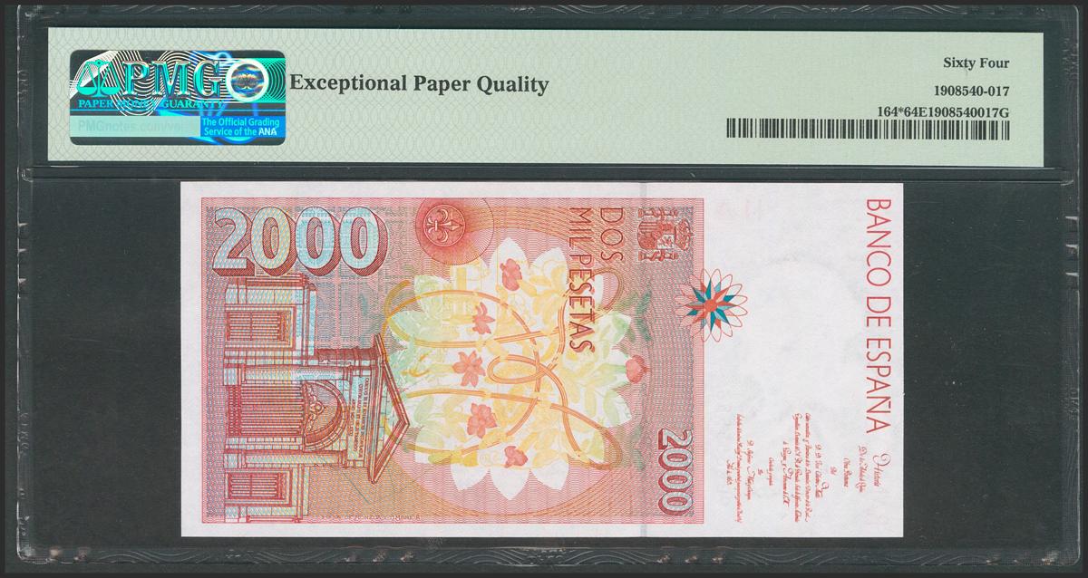 English 2000 pesetas. April 24, 1992. Special Series 9B. (Edifil 2021: 482Ab). Uncirculated. PMG64EPQ package.