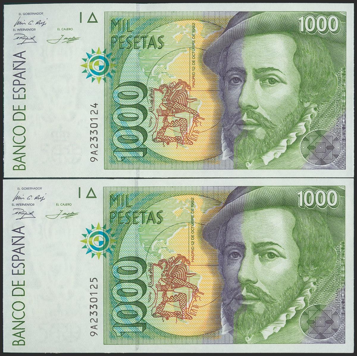 1000 Pesetas. October 12, 1992. Correlative pair. 9A special series. (Edifil 2021: 483c). Uncirculated.