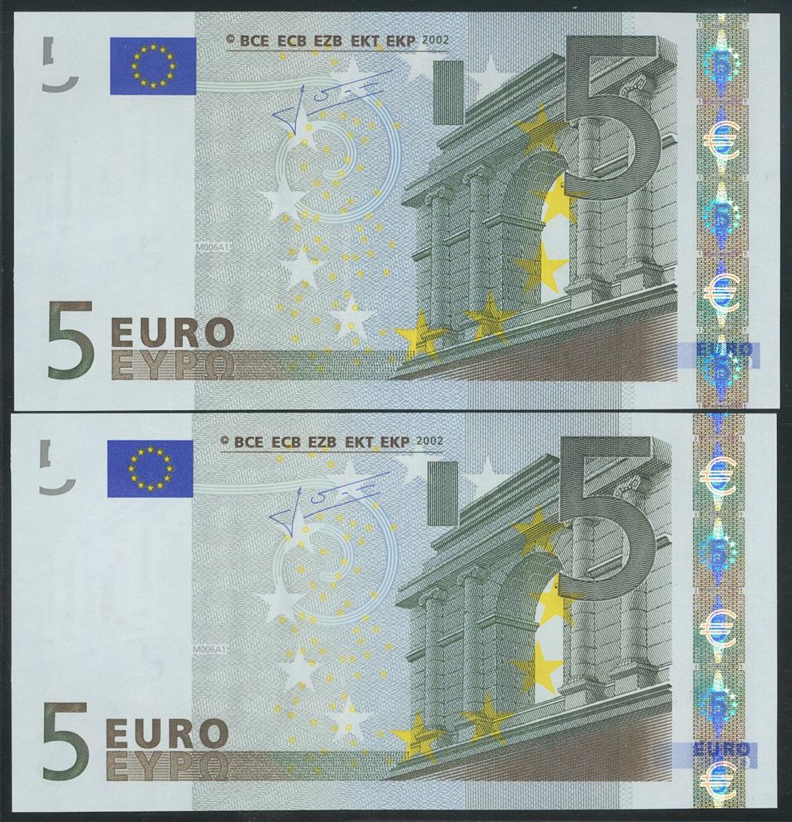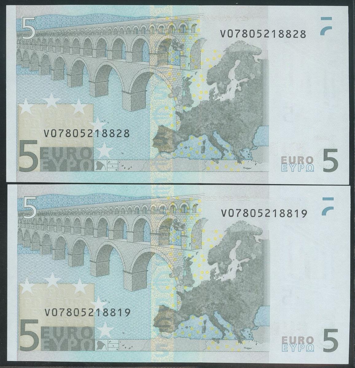 5 euros. January 1, 2002. Correlative pair (it should be remembered that the last digit of the numbering of all banknotes denominated in euros is for the internal control of the European Central Bank, the one that marks the correlation of the banknotes is the penultimate digit). Trichet signature. Series V (Spain). (Edifil 2021: 486A). Uncirculated.