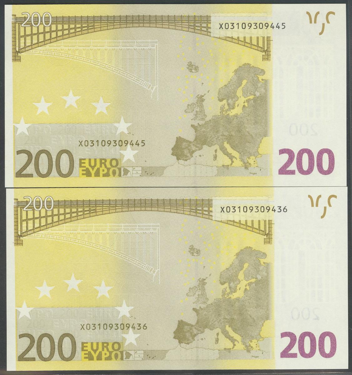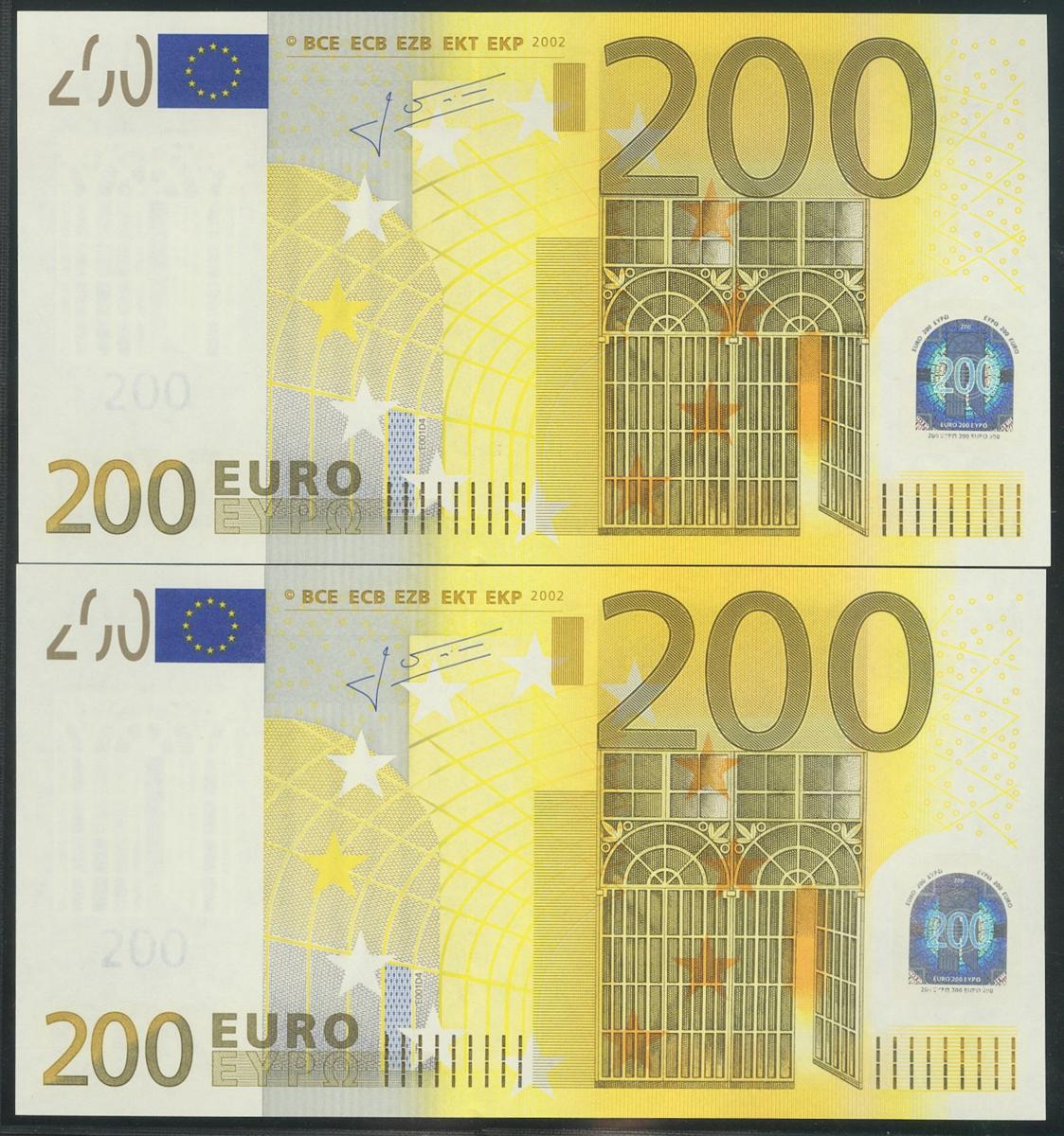 200 euros. January 21, 2002. Correlative pair (it should be remembered that the last digit of all banknotes denominated in euros is for the internal control of the European Central Bank, the one that marks the correlation of the banknotes is the penultimate digit). Trichet signature. Series X (Germany). (Edifil 2021: 491, not listed with Trichet's signature). Uncirculated.