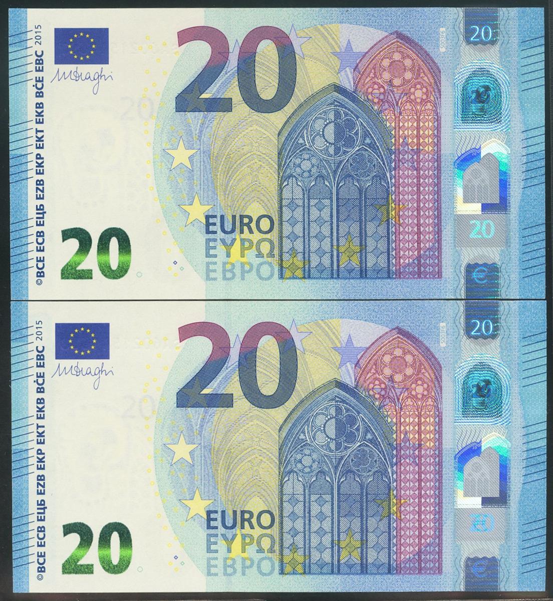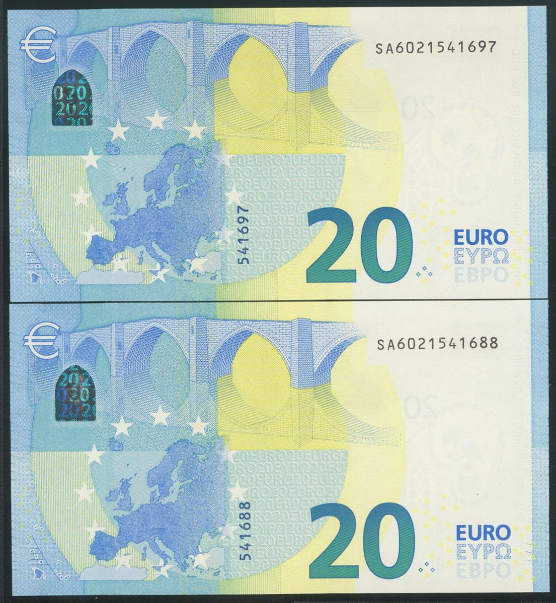 20 euros. November 25, 2015. Correlative pair (it should be remembered that the last digit of all banknotes denominated in euros is for the internal control of the European Central Bank, the one that marks the correlation of the banknotes is the penultimate digit). Draghi signature. Serie S (Italy). (Edifil 2021: 495). Uncirculated.