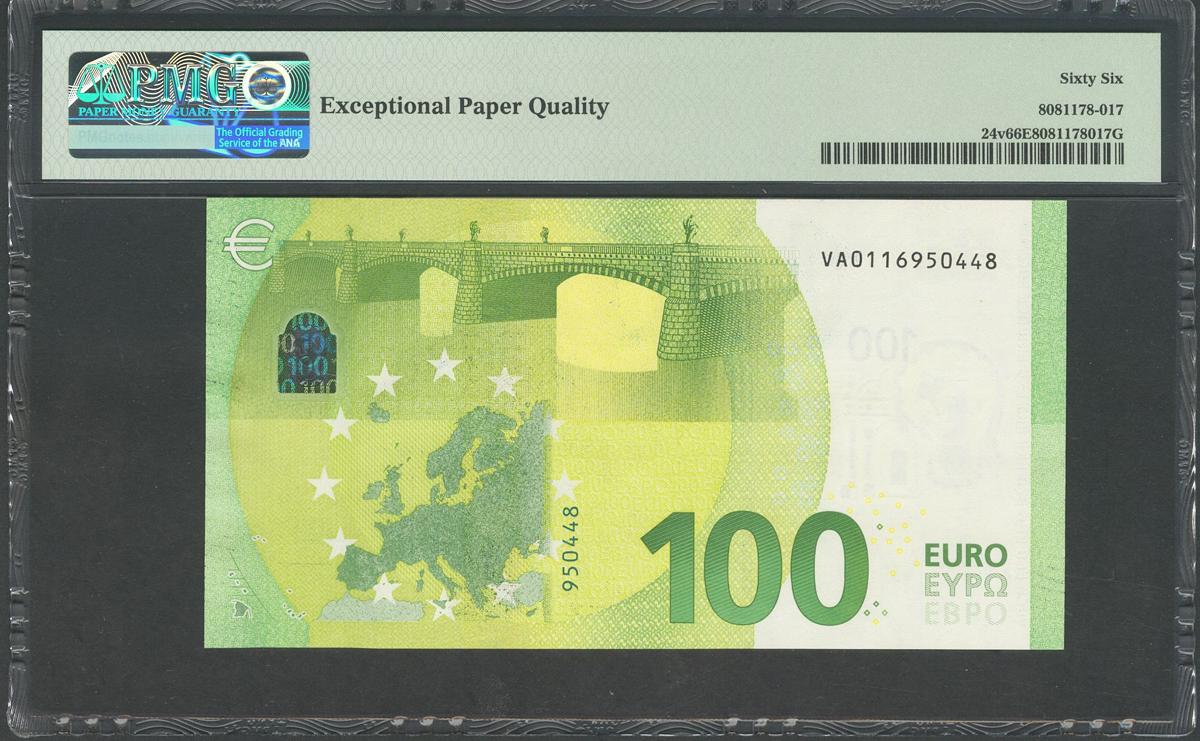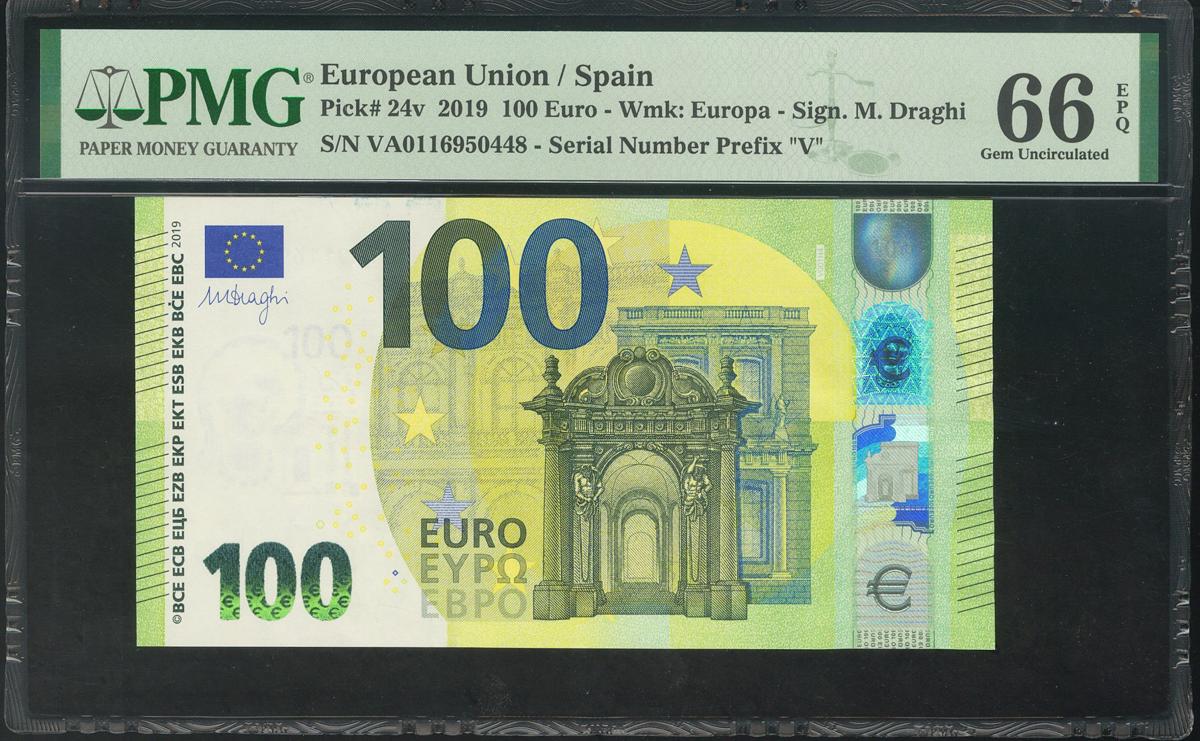 100 euros. 2019. Draghi signature. Series V (Spain). (Edifil 2021: 497). Uncirculated. PMG66EPQ package.