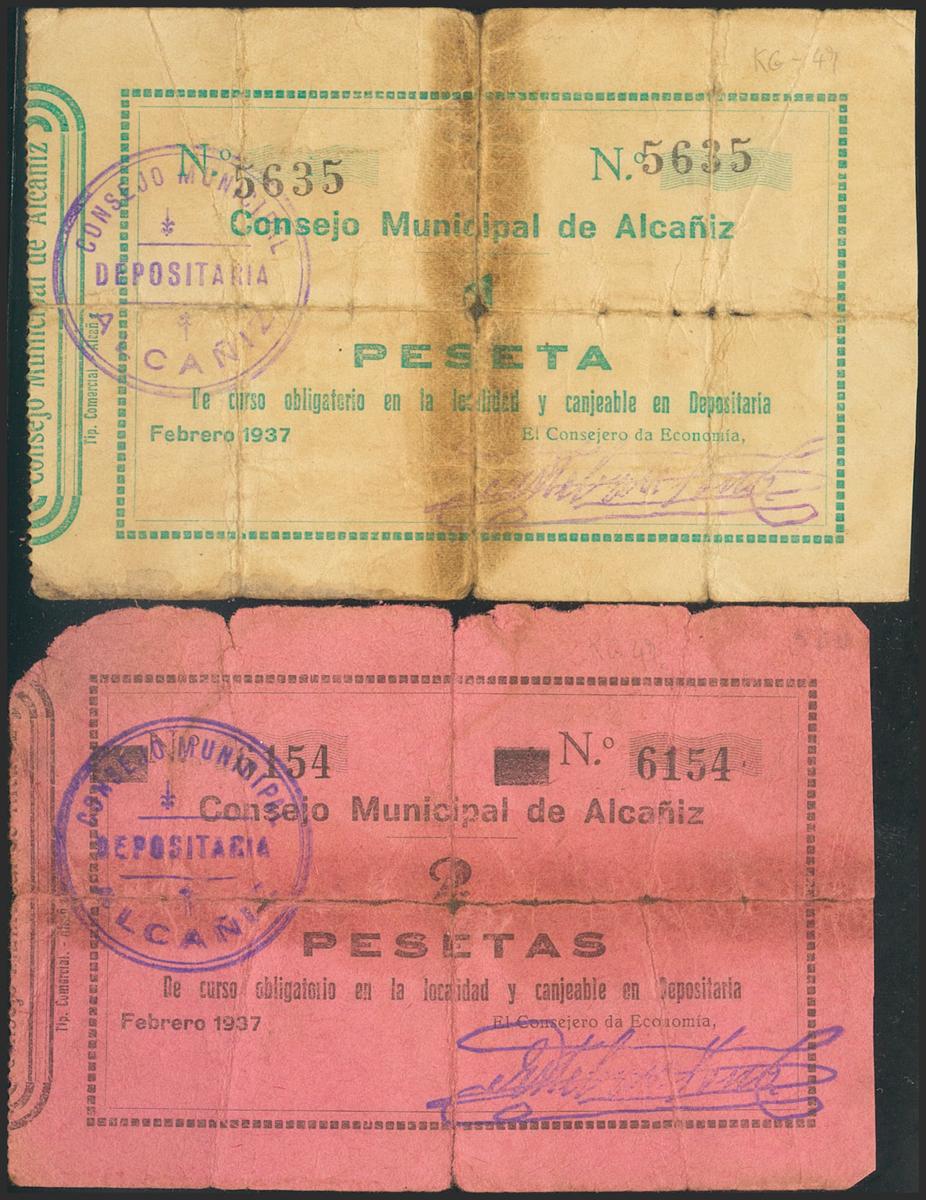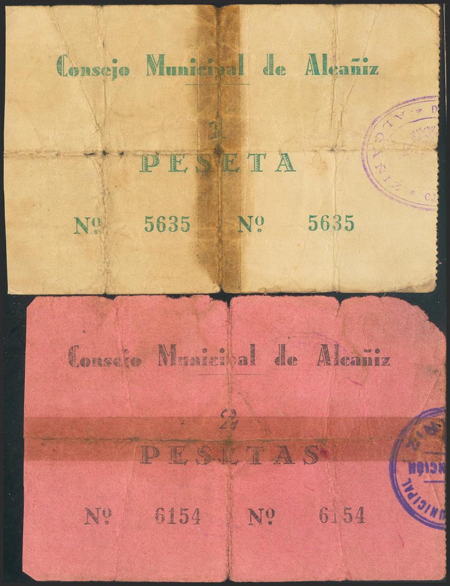 ALCAÑIZ (TERUEL). 1 Peseta and 2 Pesetas. February 1937. (González: 295/96). Complete rare series, with presence of adhesive tape on both banknotes. Good.