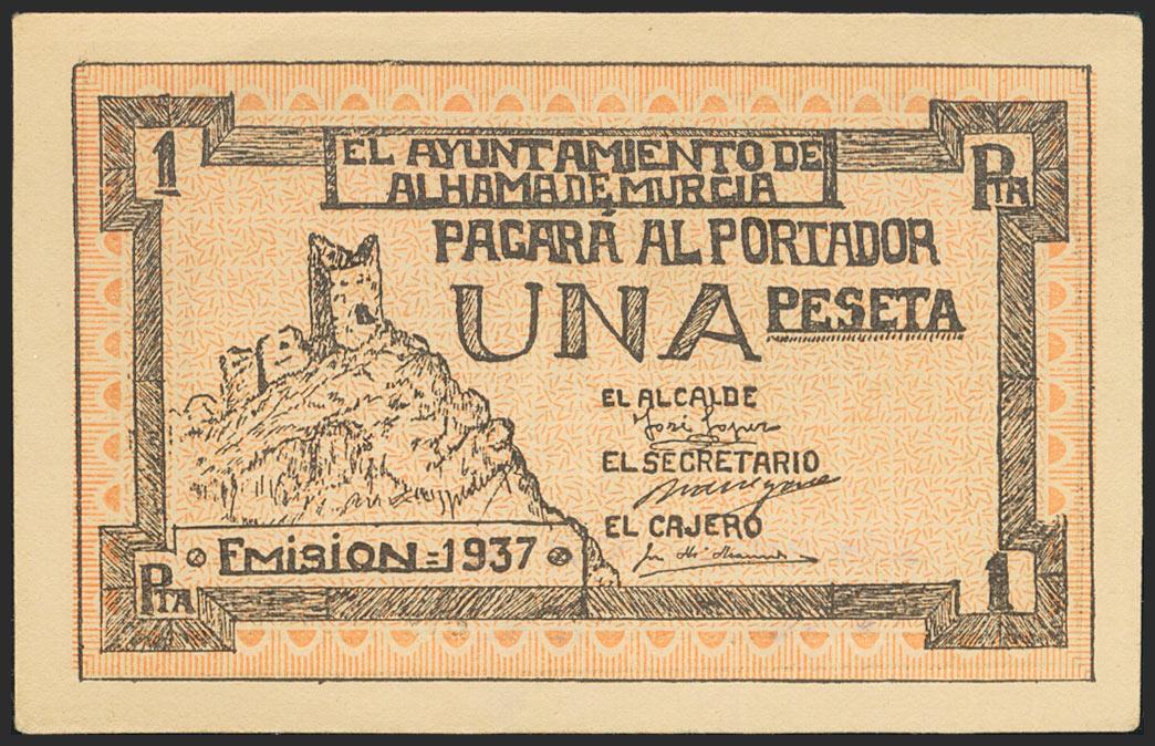 English ALHAMA DE MURCIA (MURCIA). 1 peseta. 1937. Series E. (González: 496). Unusual Almost Uncirculated.