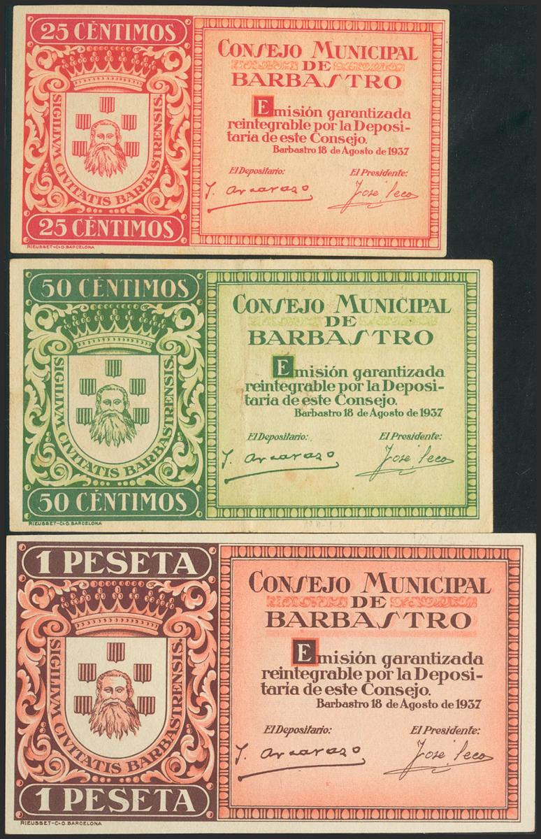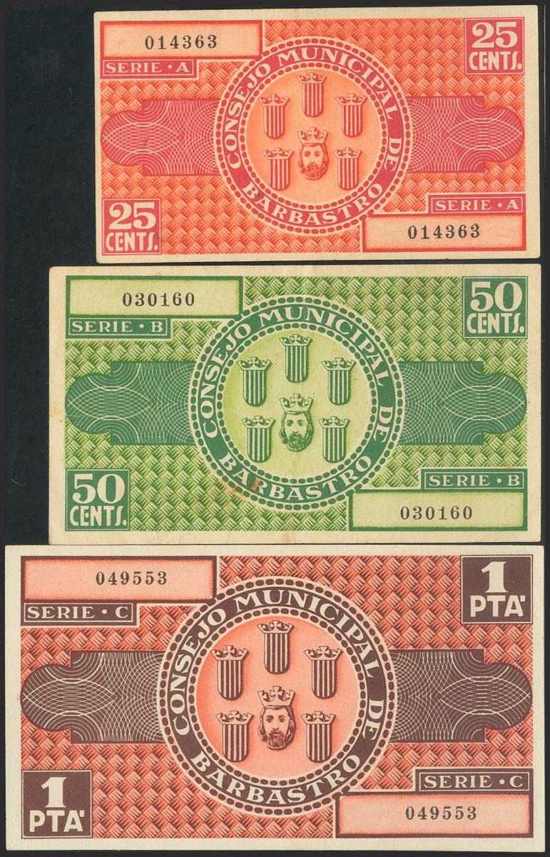 BARBASTRO (HUESCA). 25 Cents, 50 Cents and 1 Peseta. August 18, 1937. Series A, B and C, respectively. (González: 880/82). Unusual series in this quality. Almost Extremely Fine/ Almost Uncirculated.