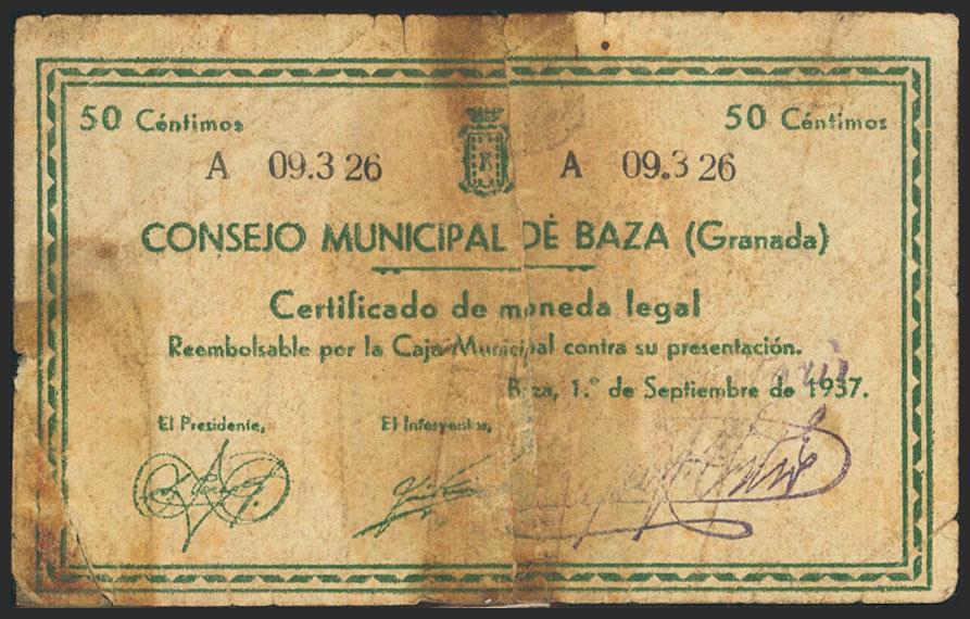 English BAZA (GRANADA). 50 cents. September 1, 1937. Series A. (González: 906). With the presence of adhesive tape. Very Good.