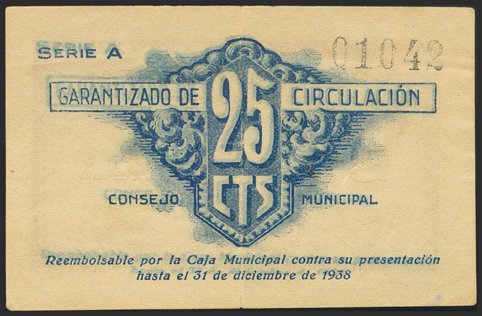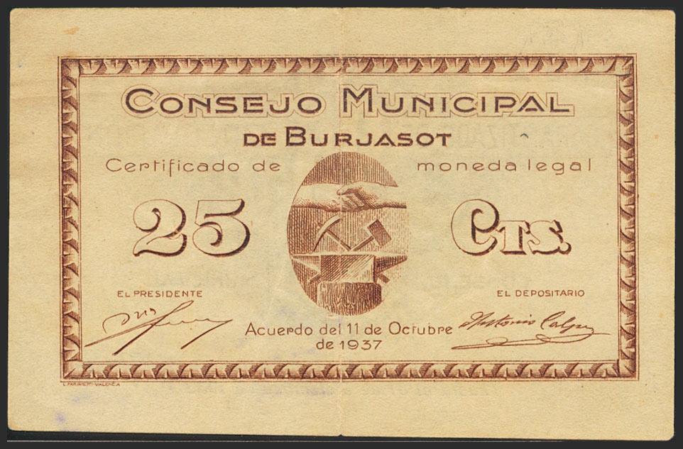 BURJASOT (VALENCIA). 25 cents. October 11, 1937. Series A. (González: 1328). Almost Extremely Fine.