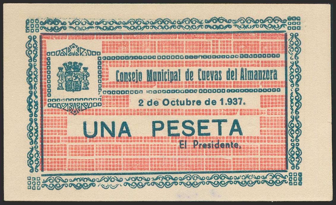 CAVES OF ALMANZORA (ALMERIA). 1 peseta. October 2, 1937. (González: 2142). Unusual Uncirculated.