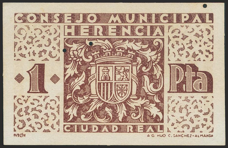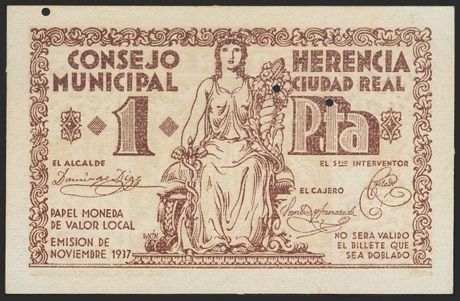INHERITANCE (REAL CITY). 1 peseta. November 1937. (González: 2823). Small drills. Good Extremely Fine.