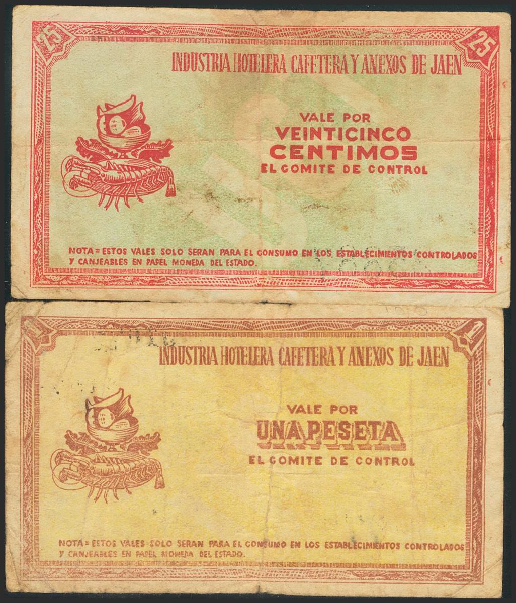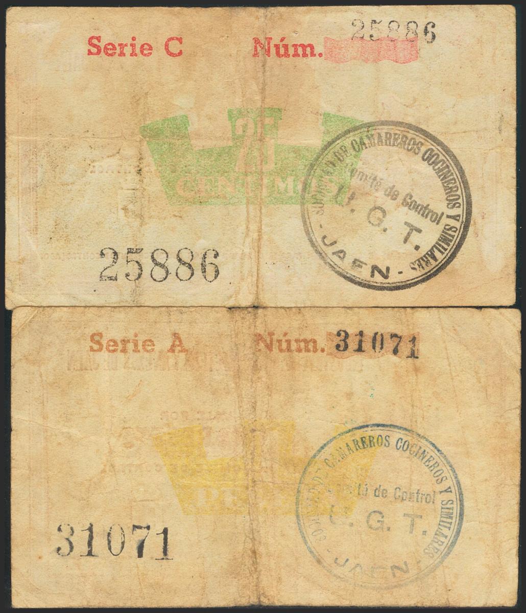 English JAEN. 25 Cents and 1 Peseta. (1937ca). Series C and A, respectively. (González: 2983, 2985). Unusual Almost Very Fine.