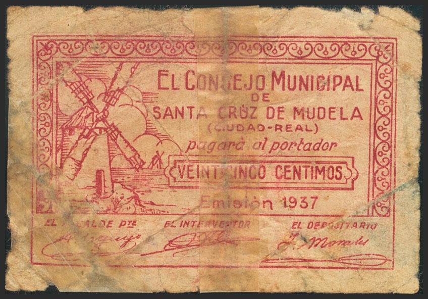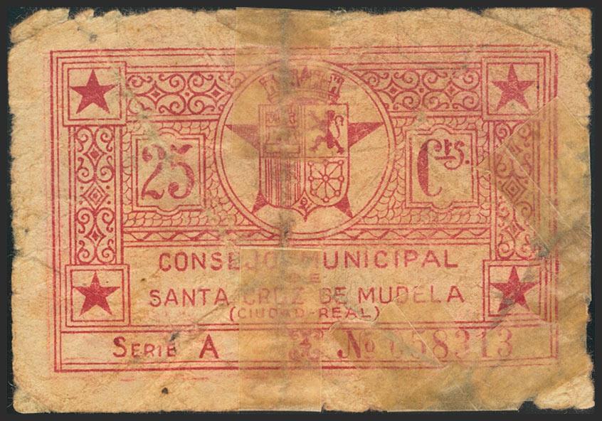 SANTA CRUZ DE MUDELA (CIUDAD REAL). 25 cents. 1937. Series A. (González: 4730). Unusual, presence of adhesive tape. Almost Good.
