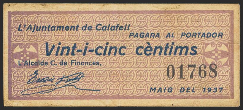CALAFELL (TARRAGONA). 25 cents. May 1937. (González: 7270). Very Fine.