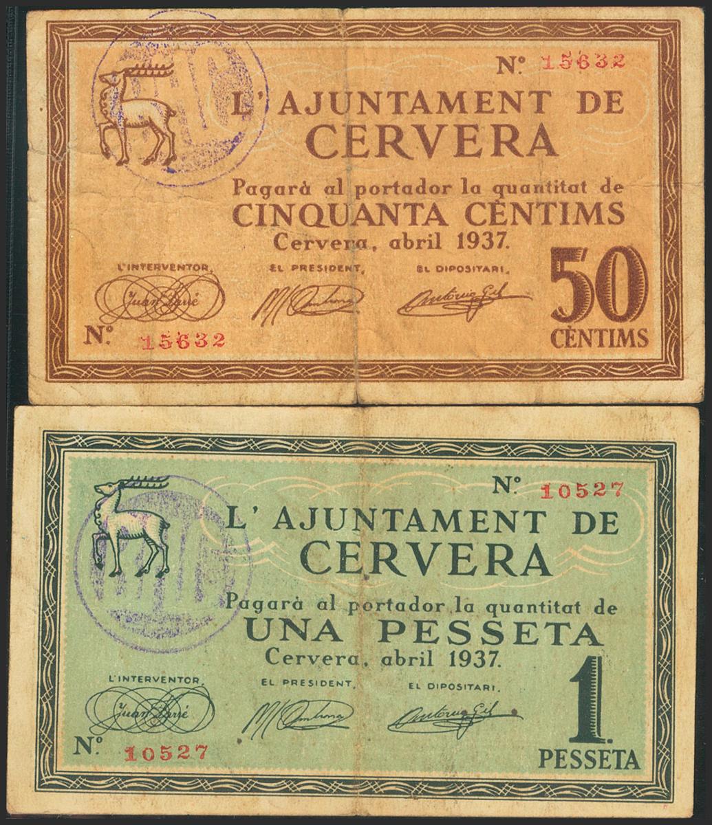 CERVERA (LERIDA). 50 cents and 1 peseta. April 1937. (González: 7556/57). Complete series. Very Fine.