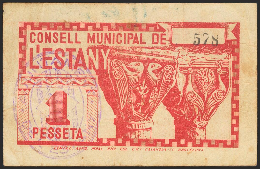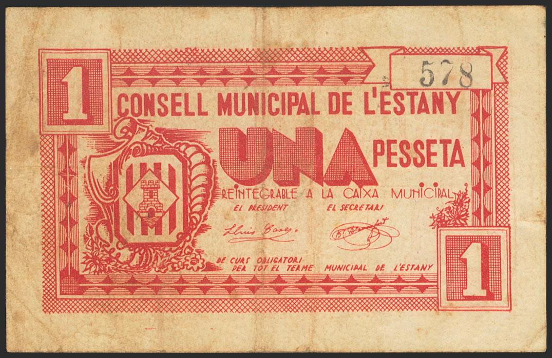 ESTANY (BARCELONA). 1 peseta. (1937ca). (González: 7799). Unusual Good Very Fine.