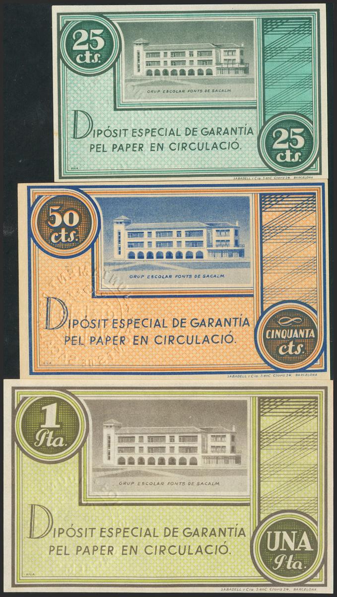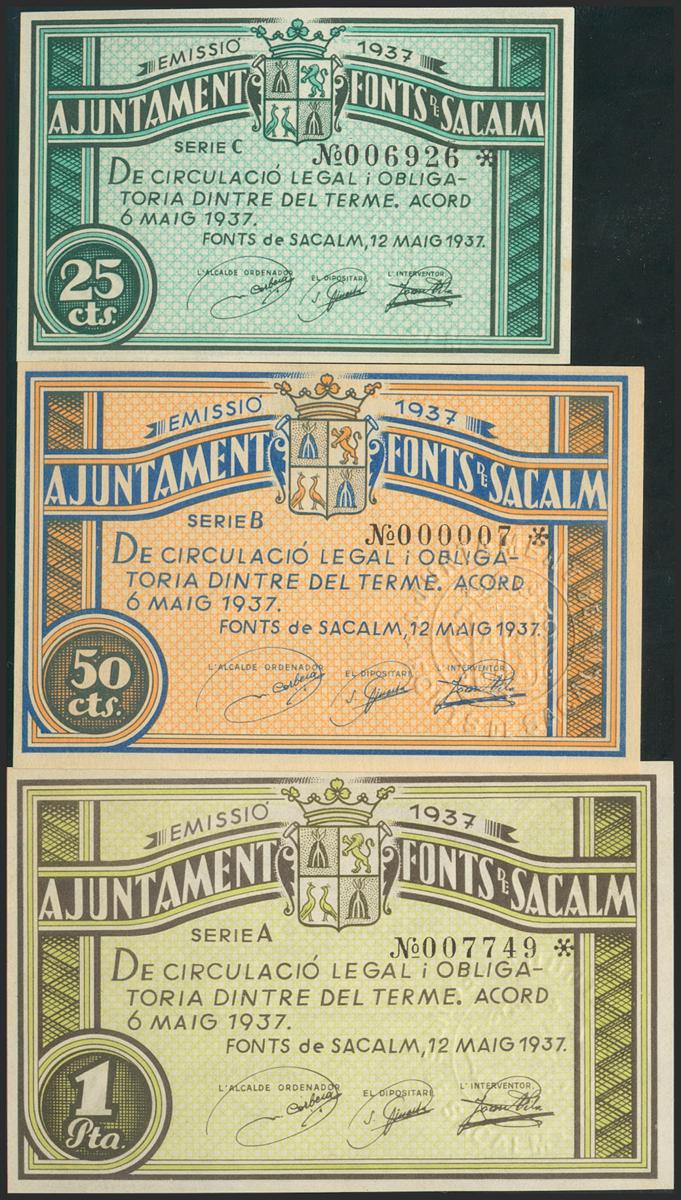 FONTS DE SACALM (GERONA). 25 Cents, 50 Cents and 1 Peseta. May 12, 1937. Series C, B and A, respectively. (González: 7912/14). Unusual complete series. Uncirculated