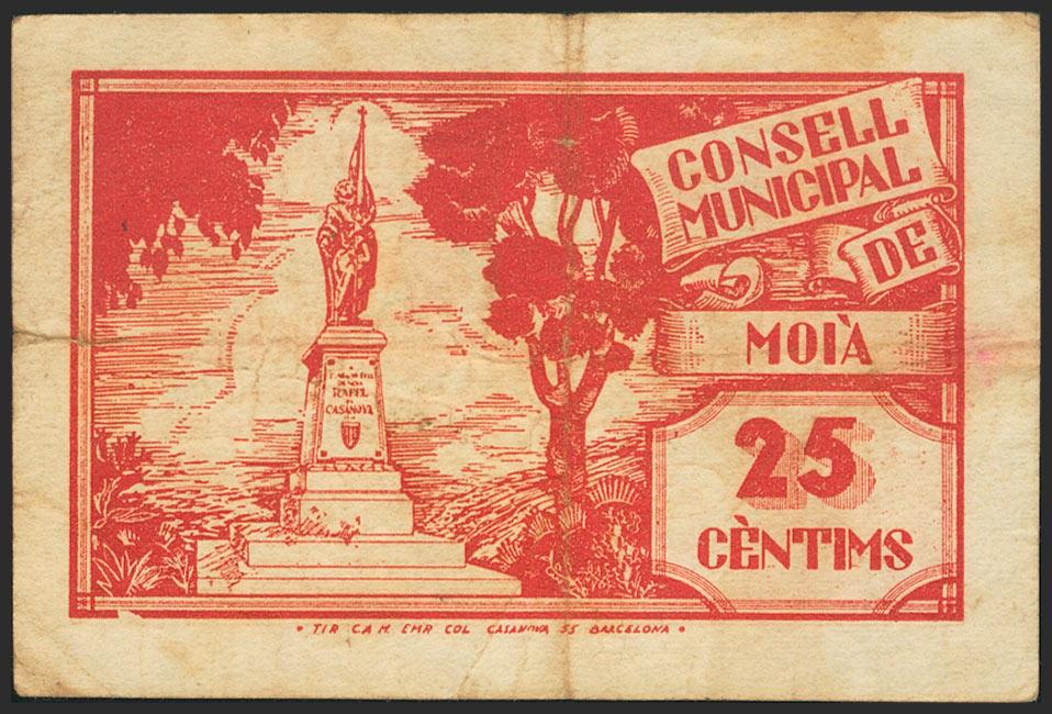 English MOIA (BARCELONA). 25 cents. (1937ca). (González: 8689). Very Fine.