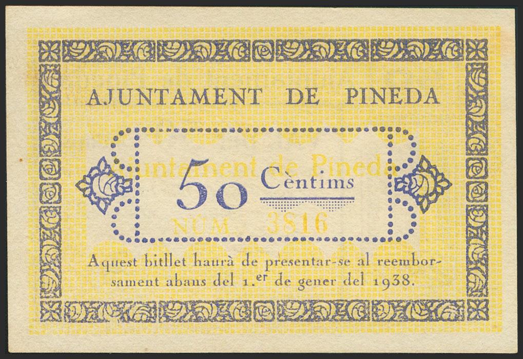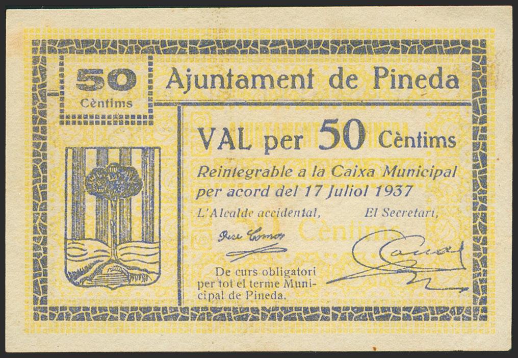 PINEDA DEL MAR (BARCELONA). 50 cents. July 17, 1937. (González: 9216). Rare Extremely Fine.