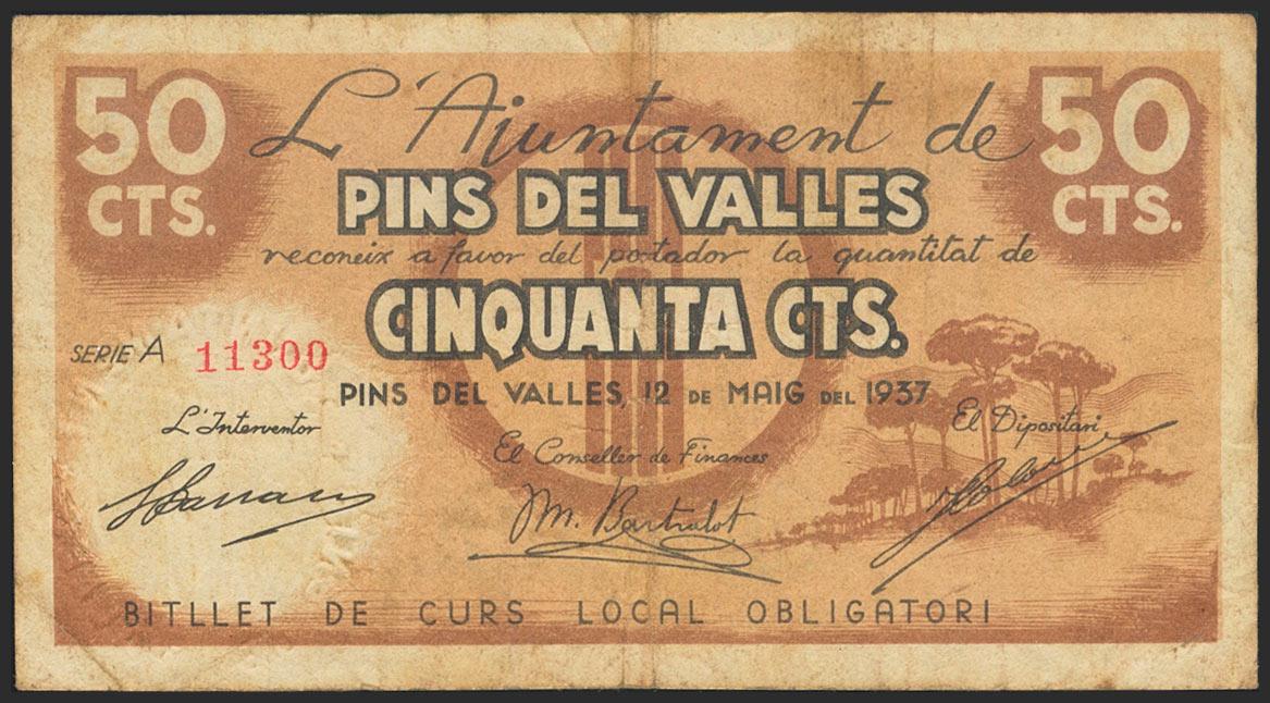 English PINS DEL VALLES (BARCELONA). 50 cents. May 12, 1937. Series A. (González: 9245). Very Fine.