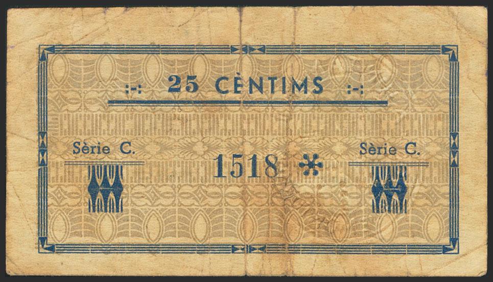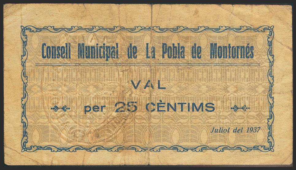 THE TOWN OF MONTORNES (TARRAGONA). 25 cents. July 1937. (González: 9331). Very rare. Almost Very Fine.
