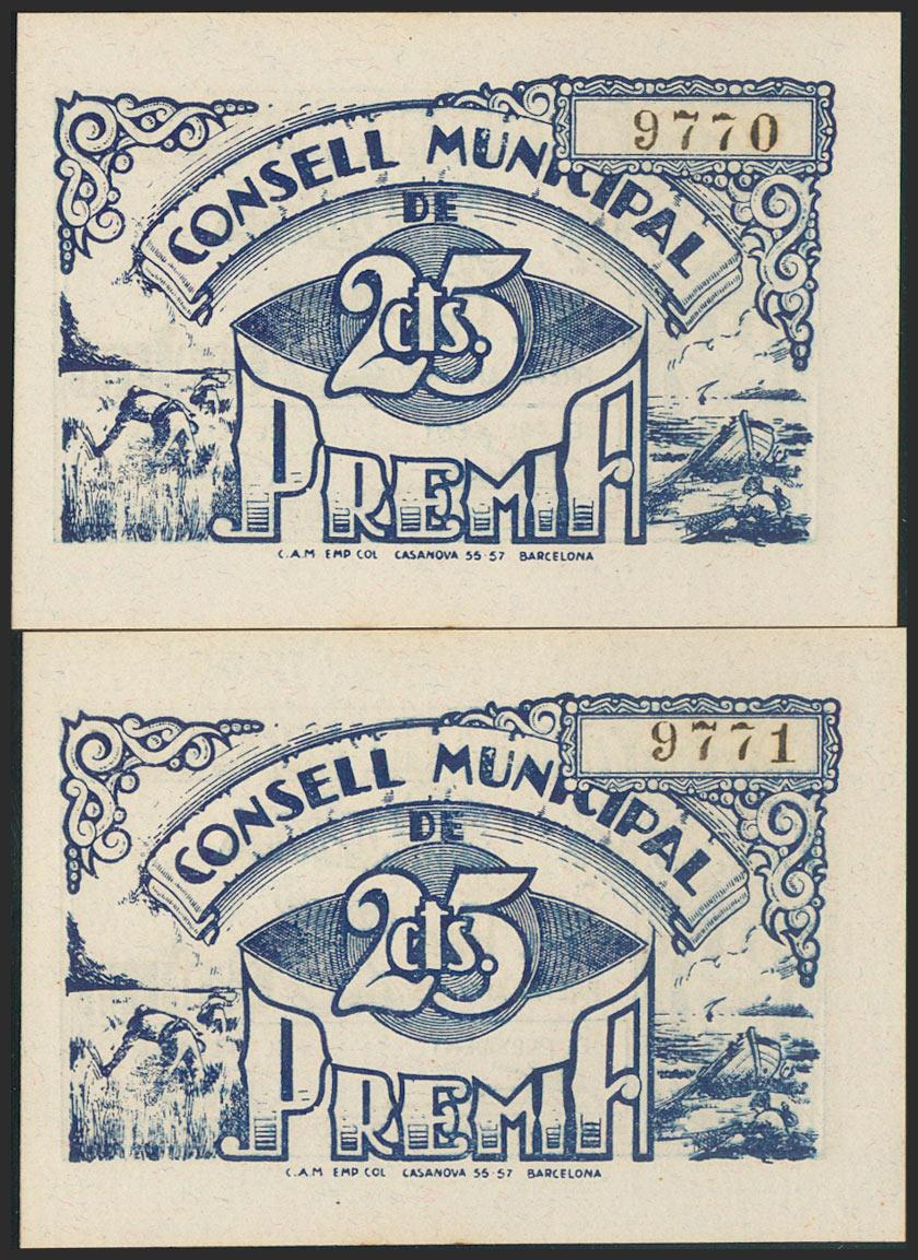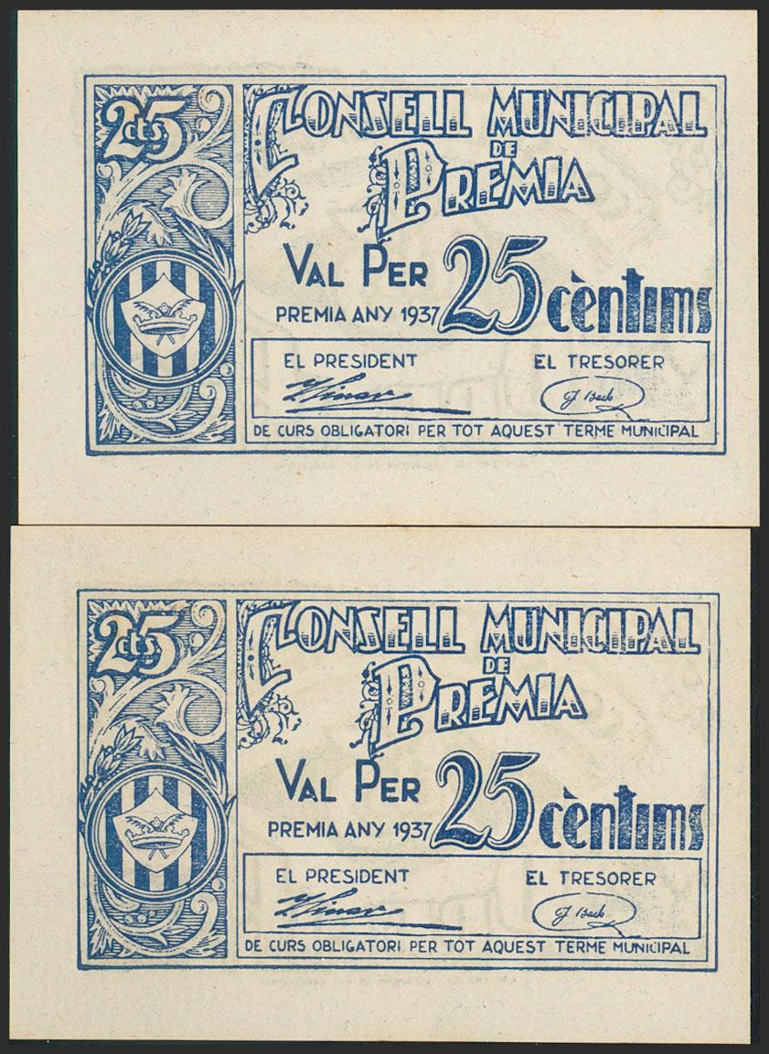 AWARD (BARCELONA). 25 cents. 1937. Correlative couple. (González: 9457). Uncirculated.