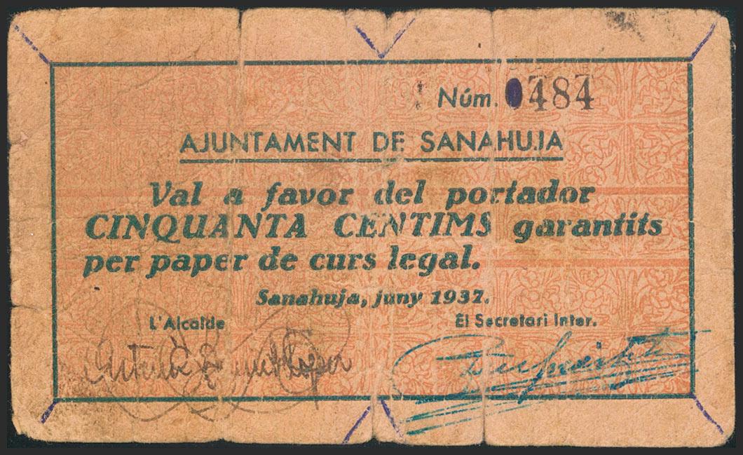 SANAHUJA (LERIDA). 50 cents. June 1937. No mayoral mark. (González: 9486). Very rare. Good.
