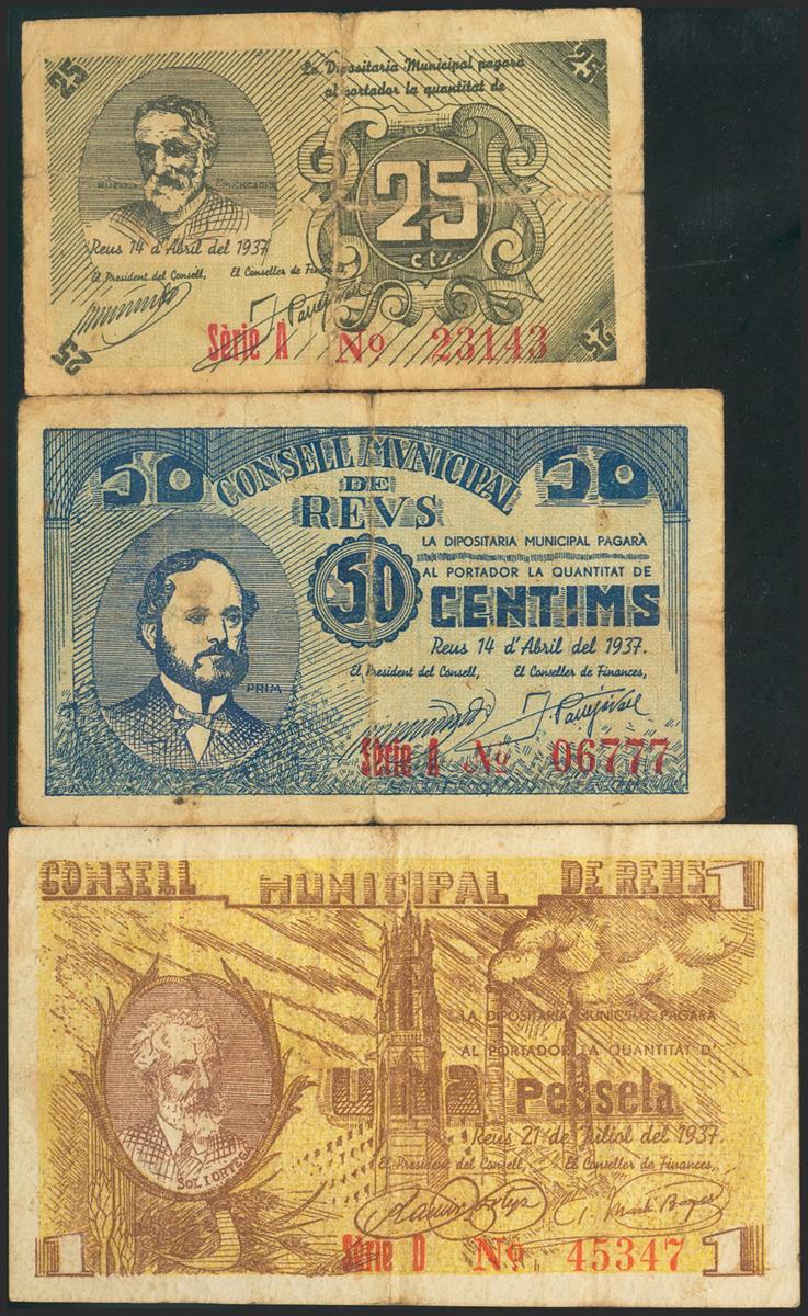 REUS (TARRAGONA). 25 Cents, 50 Cents and 1 Peseta. April 14, 1937 and July 21, 1937. Series A (2) and D, respectively. (González: 9548, 9554, 9566). Fine/ Good Very Fine.