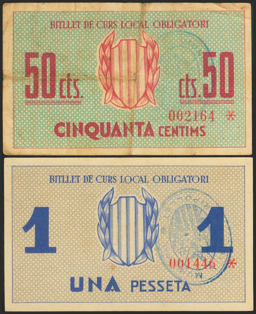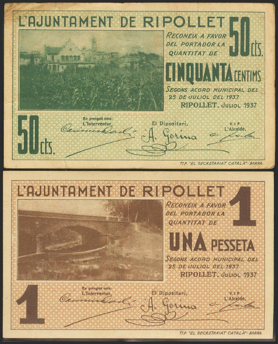 RIPOLLET (BARCELONA). 50 Cents and 1 Peseta. July 25, 1937. (González: 9667/68). Complete series. Very Fine/ Good Extremely Fine.