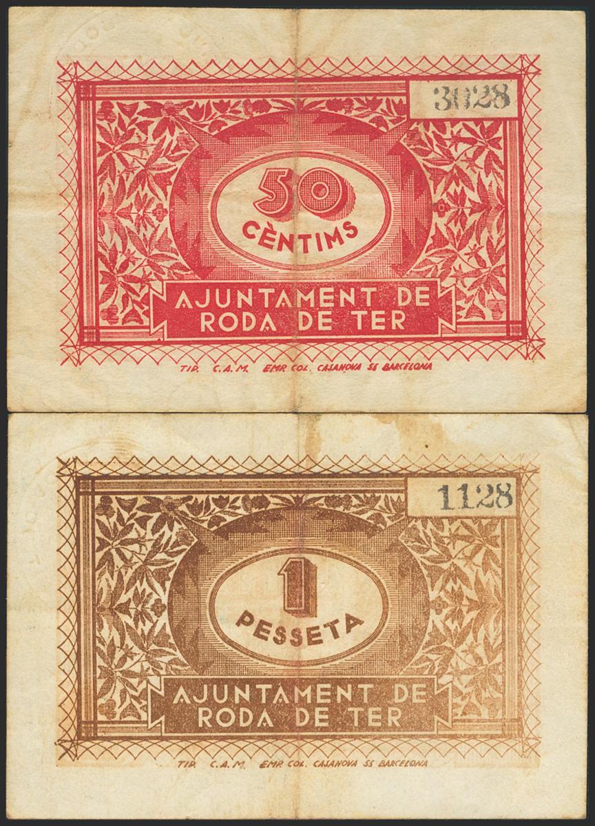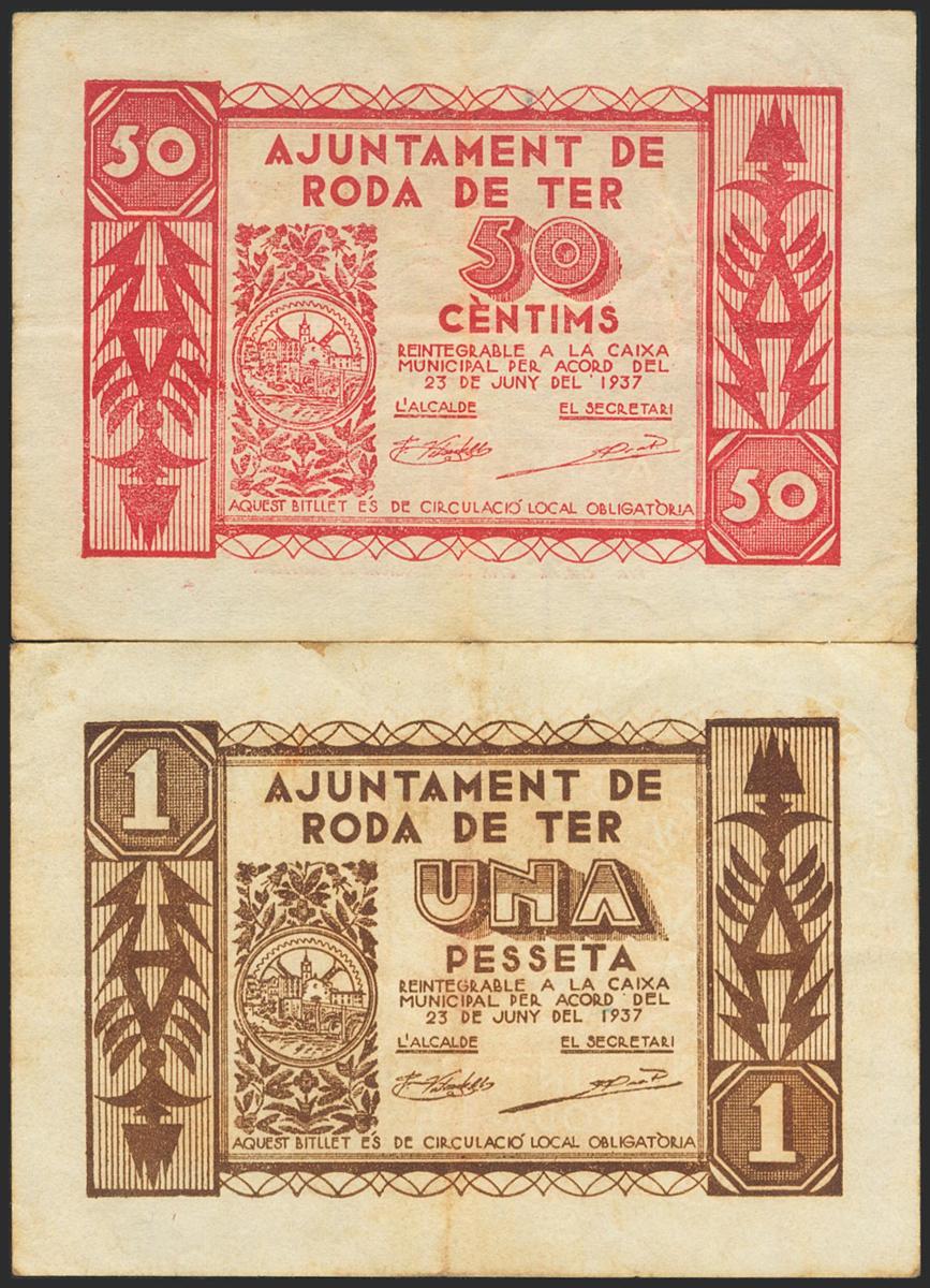 English RODA DE TER (BARCELONA). 50 Cents and 1 Peseta. June 1937. (González: 9719/20). Complete series. Very Fine.